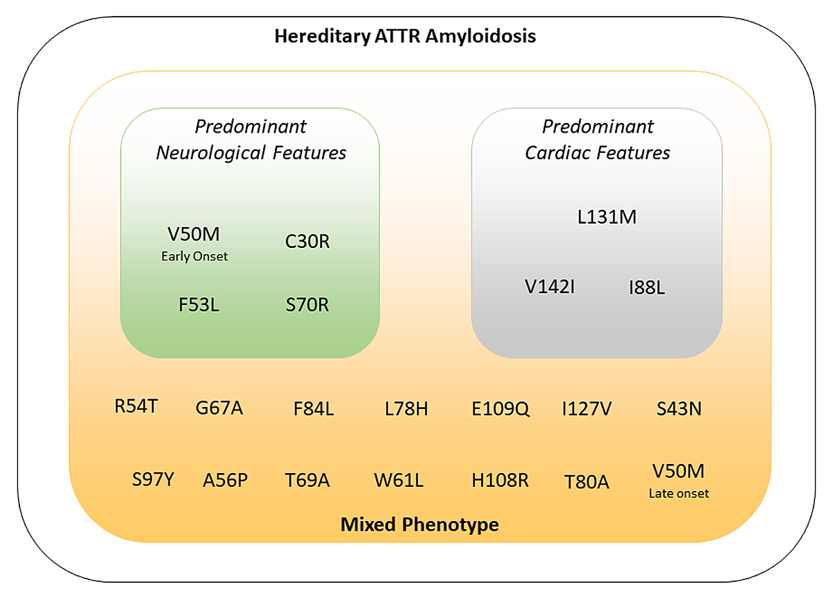 Figure 2 Correlations between genotype and phenotype in variant transthyretin amyloidosis. ATTR: transthyretin amyloidosis.