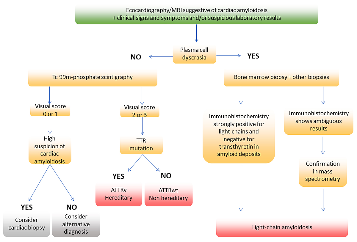 The main objective of the initial assessment is to confirm the diagnosis and rule out other amyloidosis subtypes, mainly light-chain amyloidosis. Once a diagnosis of ATTR amyloidosis is made, some of the main tasks of a comprehensive amyloidosis management are: determination of the extent of systemic involvement (staging); treatment indication and strategy; definition of follow-up intervals and tests; education of patients and their families (including genetic counselling for ATTRv amyloidosis).