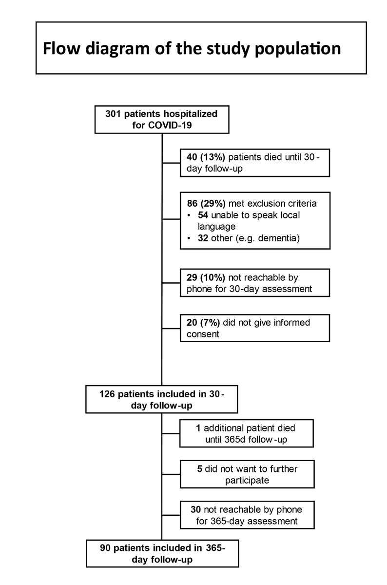 Between March and June 2020, 301 patients with COVID-19 were hospitalised at the University Hospital of Basel (n = 198) and Kantonsspital Aarau (n = 103). Figure 1 shows the flowchart of patients regarding study inclusion. Forty-one patients had died before the end of follow-up, 86 met exclusion criteria such as insufficient proficiency in the local language, cognitive impairment or severe underlying psychiatric conditions, 59 were not reachable by phone and 25 did not provide informed consent or did not want to participate any further. The final sample therefore consisted of 90 patients.
