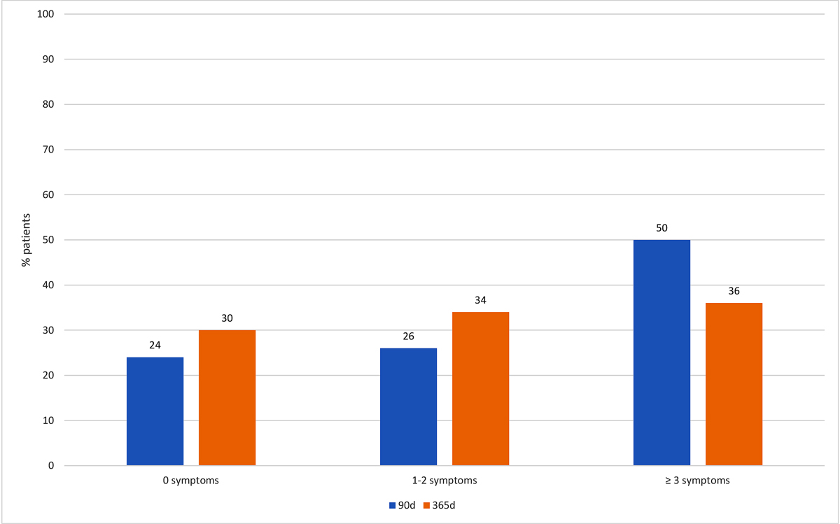 Primary endpoint: The primary endpoint of our study was long COVID 1 year after hospitalisation, defined as the presence of at least one persisting symptom which newly occurred during or after acute infection with SARS-CoV-2. This definition of long COVID was based on previous studies [3, 4] and included different symptoms known to be associated with COVID-19, including shortness of breath, fatigue, cough, chest pain/tightness, dysosmia, dysgeusia, sleep disorders, headache, concentration difficulties, joint pain, muscle pain, palpitations, post-exertion malaise, loss of appetite or nausea, vomiting or diarrhoea, fever, paraesthesia, skin disorders (rash, pruritus) and other symptoms related to patients’ initial COVID-19. Patients also rated the intensity of symptoms on a VAS (ranging from 0 – not at all to 10 – very much).