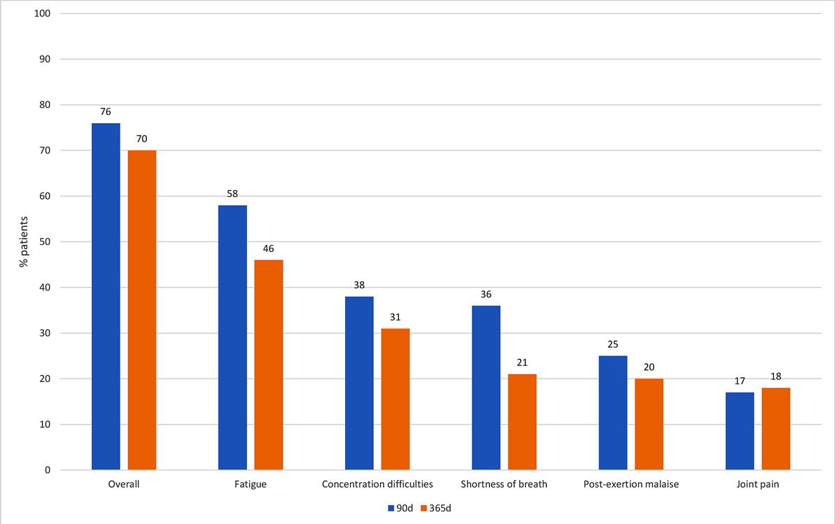 A high proportion of COVID-19 patients report symptoms of long COVID 1 year after hospitalisation, which negatively affect their quality of life. The main risk factors are associated with severity of illness and may not be modifiable. There is need for further research into prevention and treatment of long COVID, particularly in patients with a high initial severity of illness.