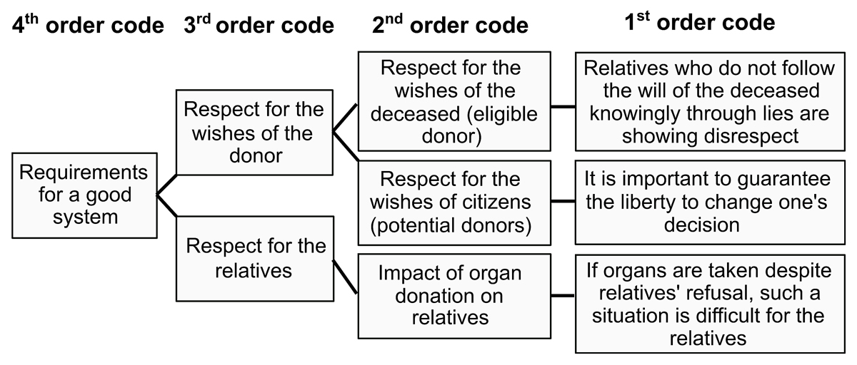 Most participants (n participants = 7; n occurrences = 31) explicitly stated that a good legislative system needs to respect donors’ wishes. Citizens should be able to express their wish during their lifetime and this wish should be followed. Some participants stated further that the deceased wish should be fulfilled even if it contradicts the relatives’ opinion.