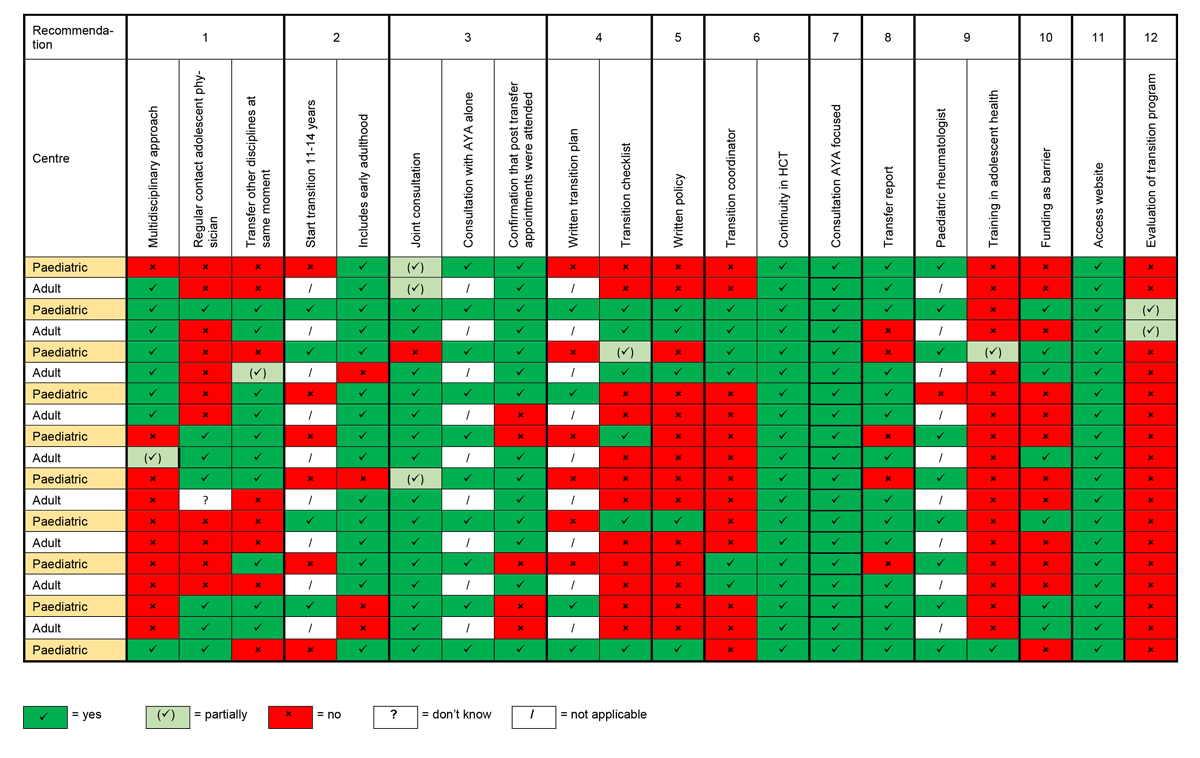 Recommendation 4: Individual transition processes and progress should be carefully documented in the medical records and planned with AYAs and their families. Six of the ten paediatric centres reported never or rarely having a written transition plan. A transition checklist (a list with themes to be addressed during the transition process in order to ensure that the AYA gains the knowledge and skills to manage their condition) is used in four paediatric and two adult centres.