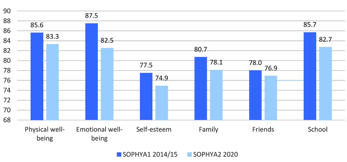 Figure 1 presents the change in the mean HRQoL scores between the two survey periods by HRQoL dimension. The largest decrease was seen for “emotional well-being”, followed by “family” and “school”. The smallest decline, and the only one which was not statistically significant, was observed in the “friends” dimension.