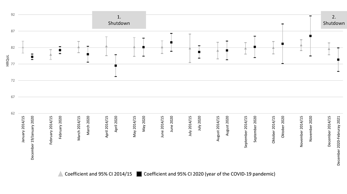 Figure 2 compares the mean monthly HRQoL scores by survey period. While the monthly means were quite stable over the years 2014/15, the scores fluctuated more in 2020 and were lowest in April 2020, coinciding with the first COVID wave and school closures, and in December 2020 and early 2021, at the peak of the second COVID wave and at the start of stronger restrictions in Switzerland.