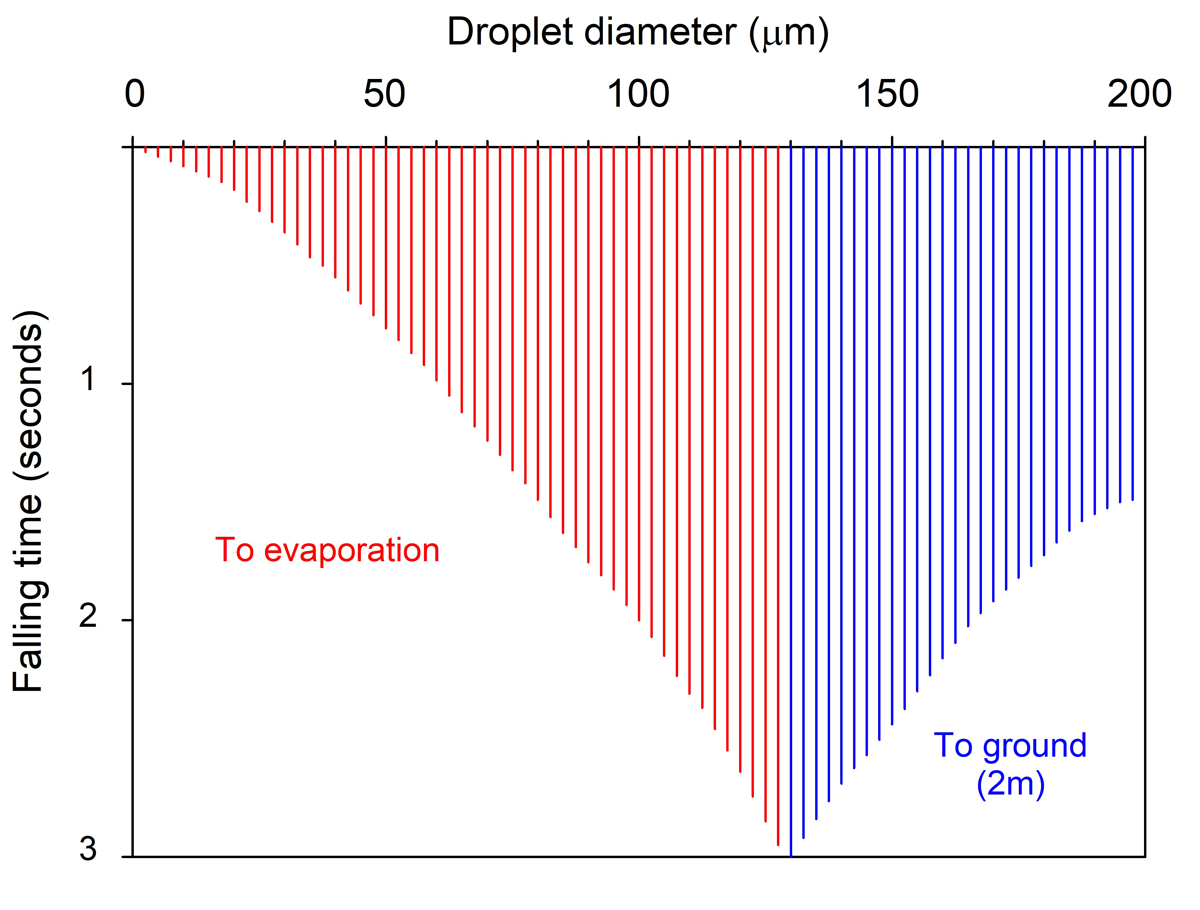 Depending on their size and the water saturation level of the air, droplets evaporate during falling. The smallest droplets never reach the ground. If a droplet contained a microorganism such as M. tuberculosis (a rod with an approximate length of 3–5 μm and diameter of 0.3–0.5 μm), the remaining droplet nucleus consists of just that organism or a clump of them. Notably, there is nothing in the report of Wells about the size defined as “droplet nucleus.” In this specific example (given the chosen water saturation and the height of fall), evaporation toward droplet nuclei ranges from >0 to 130 μm in size. (Wells also gives examples for varying air saturation.) The “life” (evaporation time) of droplets in unsaturated air is proportional to the square of their diameter, so rain drops can fall all the way from the sky, yet the smallest ones evaporate instantly [6]. Thus, Wells defined what today we call the generation of an aerosol, and he was not fixed on any specific constituent size of the individual droplet nuclei. Remarkably, Wang and collaborators suggest that sizes of up to 100 μm should be the formative quanta of an aerosol [2].
