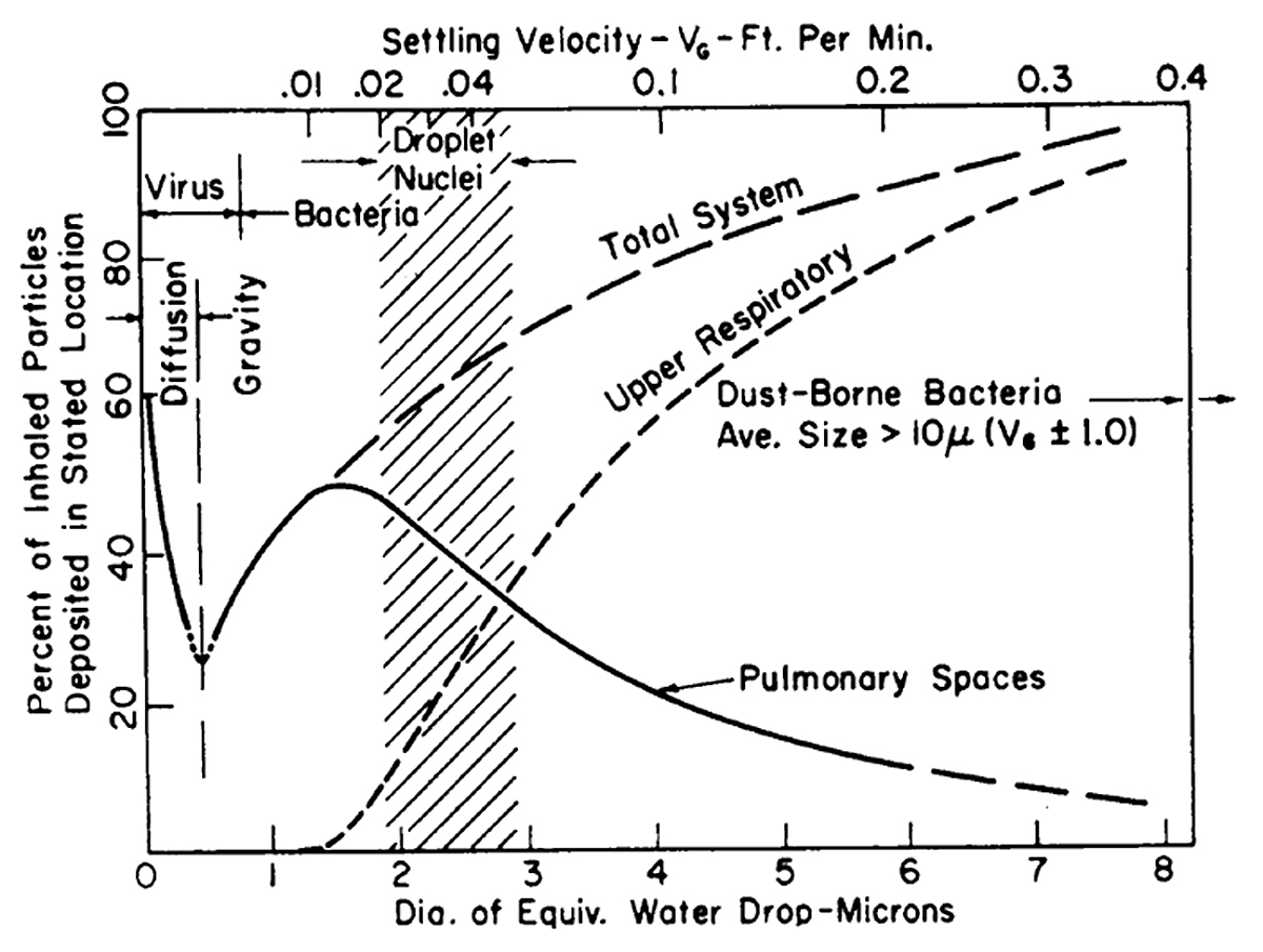 Often omitted from discussions about droplet nuclei size (and from where the often-mentioned size of 5 μm may originate) are elements that are historically rooted in M. tuberculosis and its port of entry. M. tuberculosis is ill-suited to implant itself in the upper respiratory tract (i.e., mouth, larynx and pharynx), nor in the trachea, or the bronchial tree. In the 1960s Theodore F. Hatch (fig. 3) summarised the then current knowledge showing that large particles can settle successfully in the upper respiratory tract, but only particles of sizes less than 10 μm have a reasonable probability to reach the deeper spaces of the lung [9].