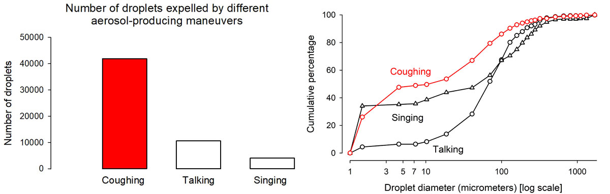 Figure 2 Comparative quantity of droplets produced by three respiratory manoeuvres (left) and cumulative proportional distribution of the sizes of expelled droplets by type of respiratory manoeuvre (right). Figure constructed from Loudon’s data [8], used with the permission of the publisher. The authors, editors, and The American Thoracic Society are not responsible for errors or omissions in adaptations. 1 μm [micrometer] = 0.001 mm