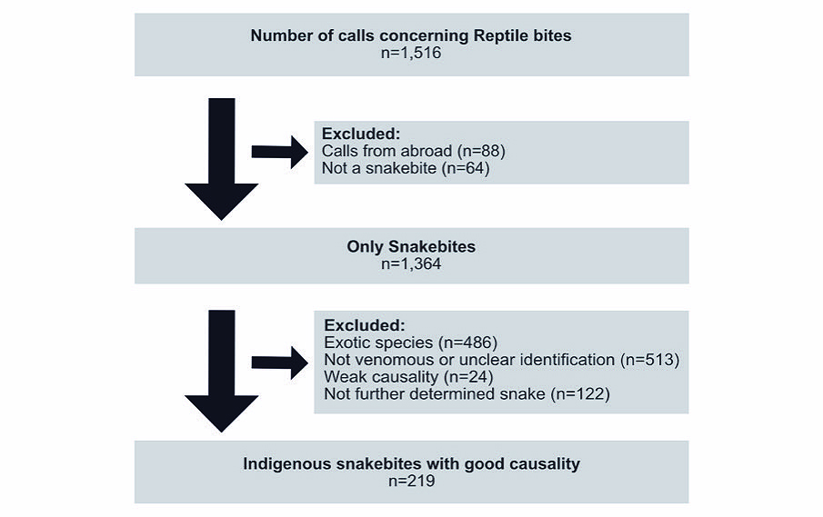 Inclusion criteria were all calls related to indigenous snakebites with medical follow-up, identification of the snake by a herpetologist, and/or with compatible symptoms and circumstances of exposure when identification was not possible. Exclusion criteria comprised non-venomous snakes or lizards, exotic snakes, calls where a snake had not been observed and the symptoms did not correspond to a potential snakebite, calls from countries other than Switzerland and Liechtenstein, and calls from Swiss citizens bitten abroad. If several callers (e.g., first members of the general public, then the hospital physician, who might call several times) reported on the same episode, all of these were aggregated into one case. Follow-up was graded according to the Poisoning Severity Score [17]. Only cases with good causality, where the temporal context and the symptoms and/or circumstances of exposure were compatible with an indigenous snakebite and thus considered probable, were included in the analysis (fig. 3). Statistical analysis were performed with IBM SPSS Statistics, Version 25 (2020) and Microsoft Excel, Version 2015. We report counts and percentages (%), mean or median values as appropriate.
