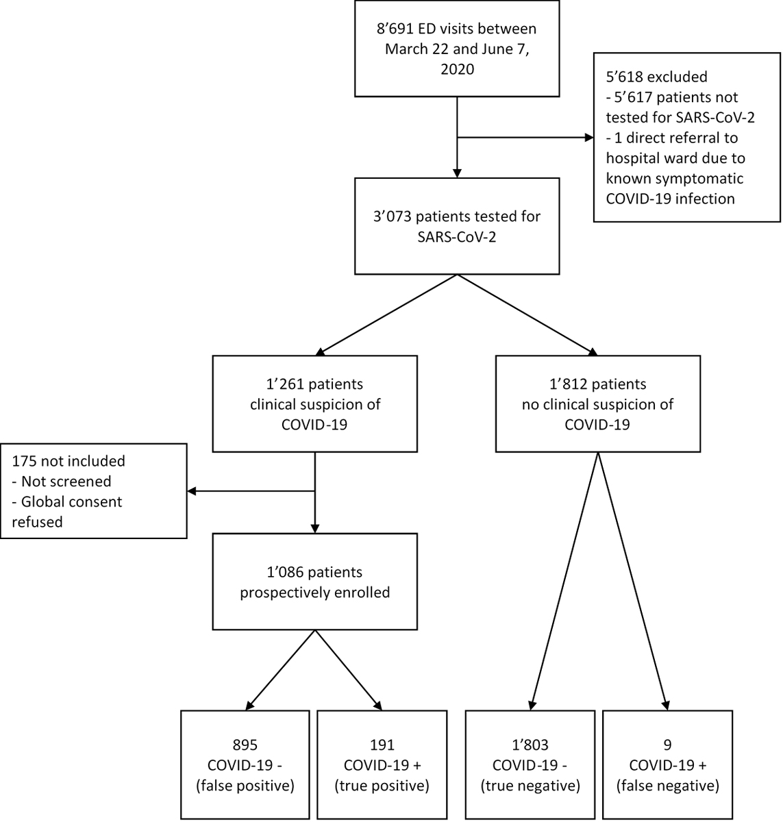 Figure 1 Flow of patient inclusion. Out of 8691 emergency department (ED) patients during the study period, 3074 were tested for SARS-CoV-2, of whom 176 patients were excluded. The final study population included 1086 patients suspected of COVID-19, consisting of 895 COVID-19 negative and 191 COVID-19 positive ones, and 1812 patients not suspected of COVID-19, consisting of 1803 COVID-19 negative and 9 COVID-19 positive ones.