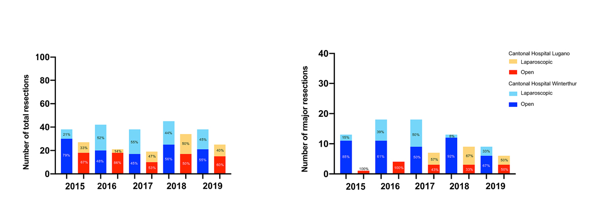 Figure 1 shows the annual caseload of total liver resections and of major liver resections for each cantonal hospital from the years 2015 to 2019. The proportion of all laparoscopically performed liver resections peaked at 55% and of all laparoscopic major liver resections at 67% in the two hospitals and did not increase any further. The maximum caseloads of all liver resections achieved at Winterthur and Lugano per year were 45 and 34 resections, respectively.