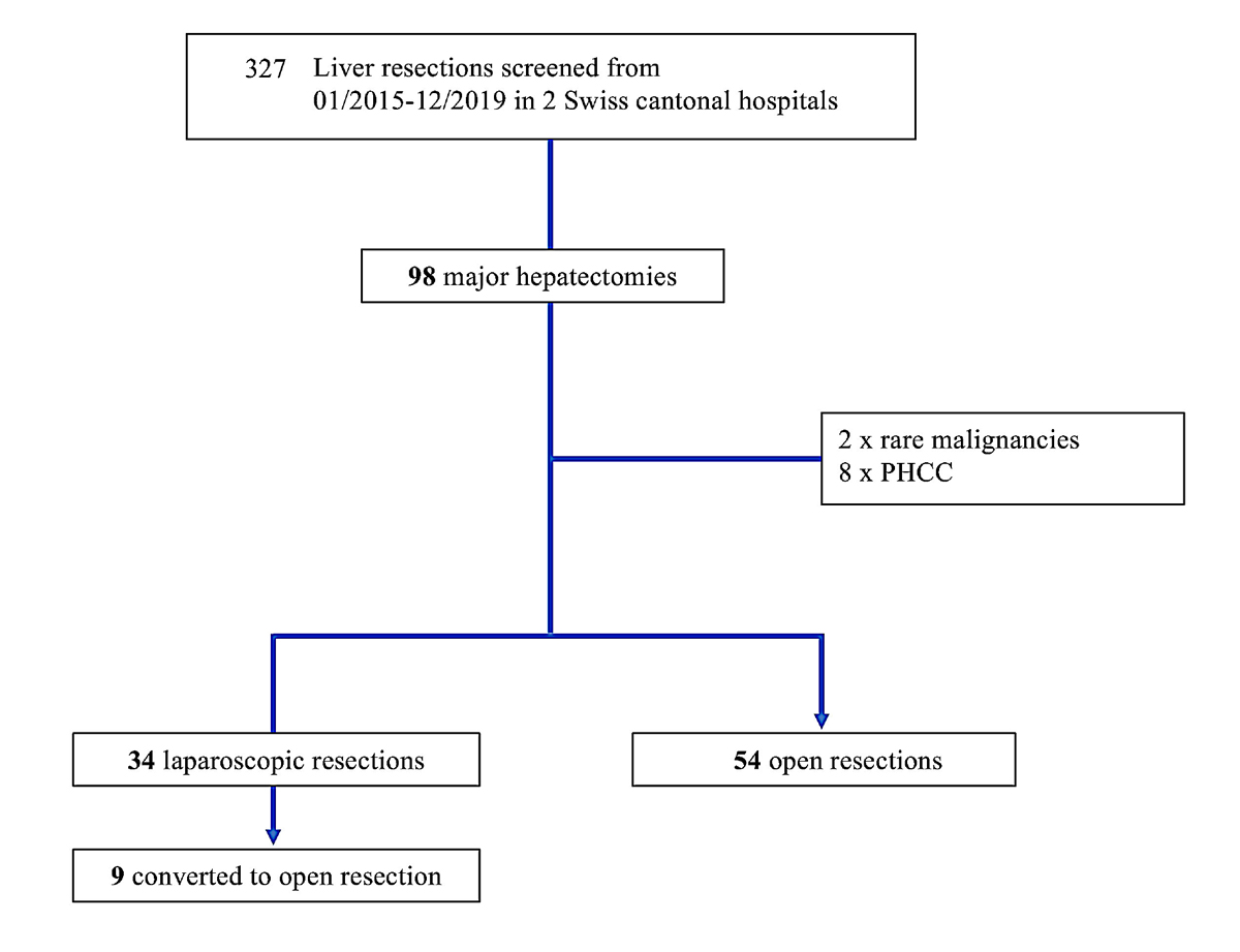 The aim of this Swiss cohort study was to compare the outcome of laparoscopic versus open major hepatectomies and correct for confounders in two cantonal hospitals that have been committed to the use of advanced laparoscopy for major hepatectomies since 2015.
