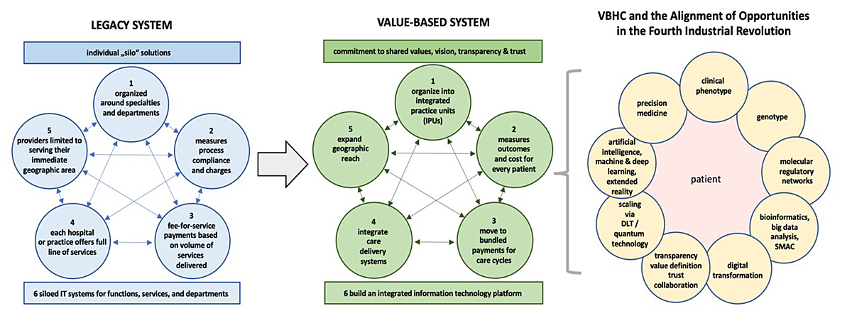 Figure 1 The legacy system evolved over decades and is based on individual silo solutions of single institutions without exchange. The value-based system builds on shared commitment to defining and assessing quality and outcome using a shared information technology platform. Such an integrated system will prepare our health system to meet the opportunities of the fourth industrial revolution.