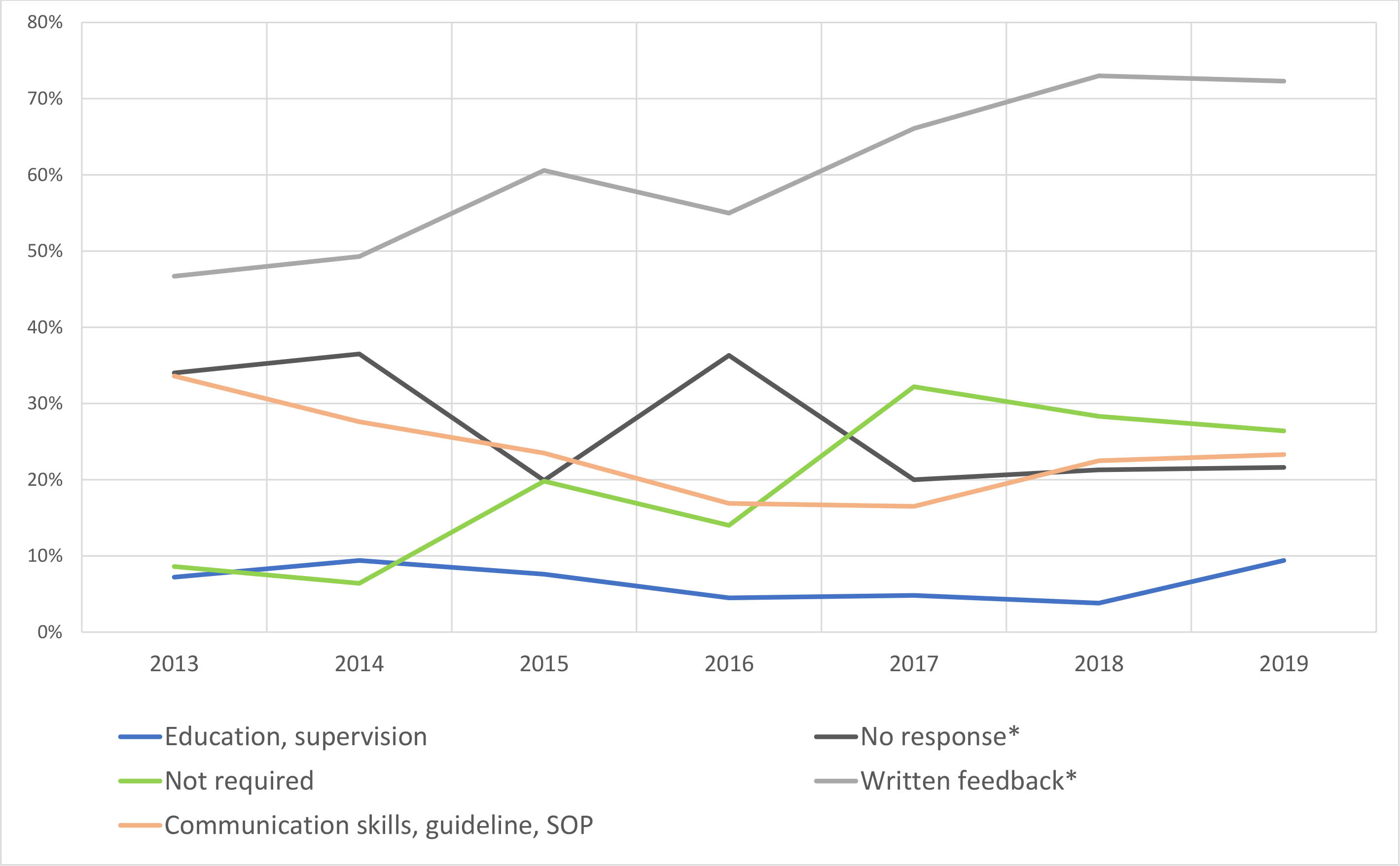 In 67.7% (3719/5493) of the cases, the CIRS teams recommended or initiated actions following a report. Most of these actions (23.6%) aimed at improving communication between employees and/or within teams involved in the CIRS case (e.g., creating or improving standard operational procedures (SOPs)). The other categories (organisation and process, technical and material) remained at a constant low level, accounting for less than 10% each throughout the observed period (table S5, appendix). From 2017 onwards most commonly, no actions were initiated (labelled as “Not required”). In 21.6% (2019) CIRS teams did not respond to the reports at all (labelled as “No response” in figure 6). An increasing number of reporters received written feedback from the CIRS teams.