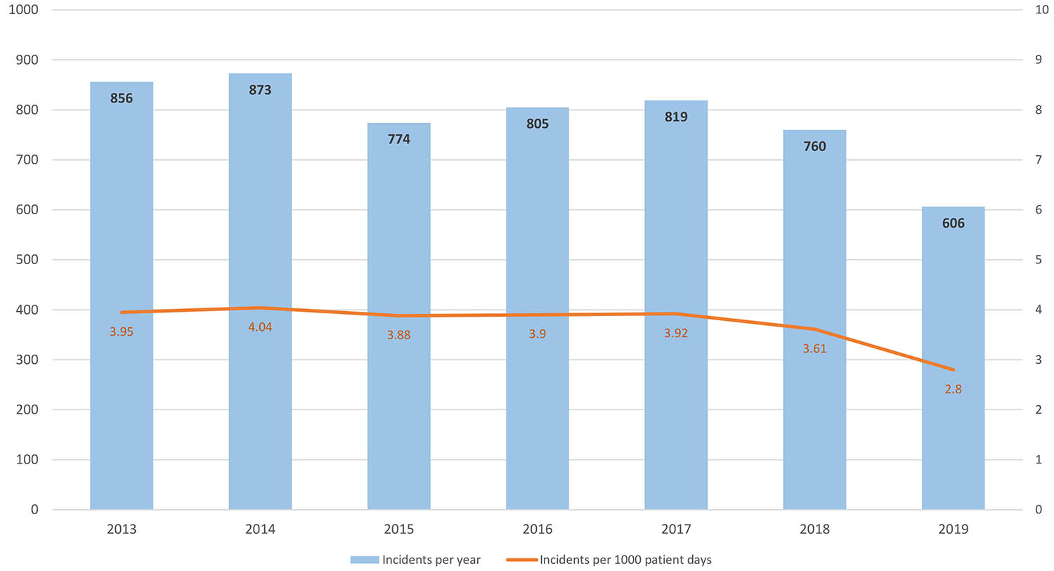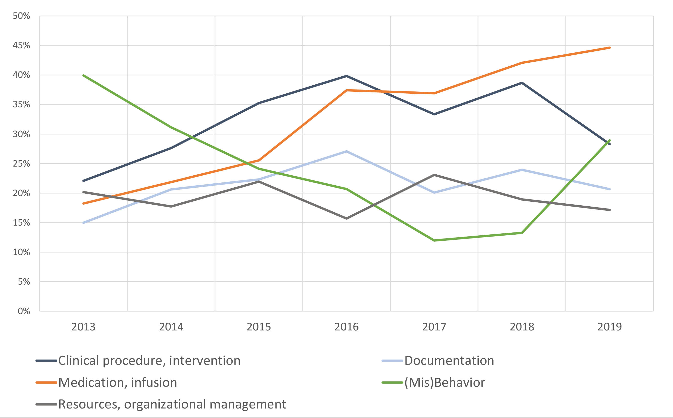 Medication-related incidents became the leading type of incident in the past three years. The high frequency of medication errors compared with other incident types has also been reported in other studies [20, 25]. Nevertheless, we were surprised by its steady increase although this is a widely known issue that usually receives special attention by the hospital’s risk management. Possible reasons could be that patients nowadays receive an increasing number of drugs with more complex protocols, particularly in tertiary referral hospitals as ours. Moreover, turnover of employees is high in university hospitals, possibly contributing to communication errors, which were also consistently among the top three types of incident. The geographic location of our hospital could be an additional factor to explain medication and communication errors: it is situated at the border of three countries (France, Germany and Switzerland); many employees were educated in one of these countries, with slightly different curricula and terminology, and in different languages. The increase in incidents related to behaviour could be due to the implementation of electronic special medication ordering systems within clinical specialties. A lack of interoperability of the patient data management systems used might provoke workarounds to maintain flow of information and documentation.