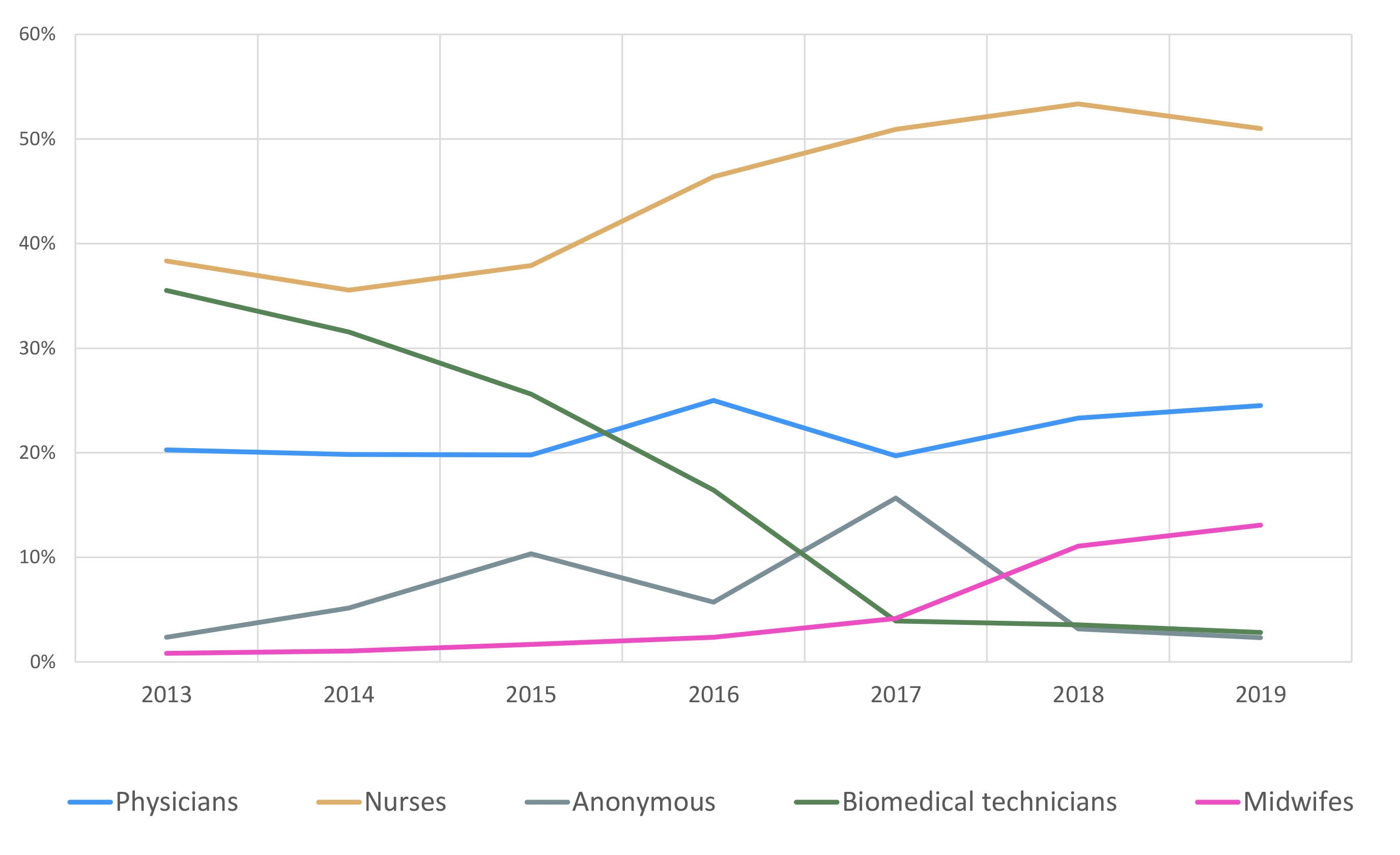 The majority of reports were submitted by nurses (n = 2432, 44.3%), followed by physicians (n = 1186, 21.6%) and biomedical technicians (n = 984, 17.9%). The longitudinal trends of all professional categories are shown in figure 2. Reporting by nurses and midwives increased and those by physicians remained stable, whereas reporting by biomedical technicians decreased significantly with time.
