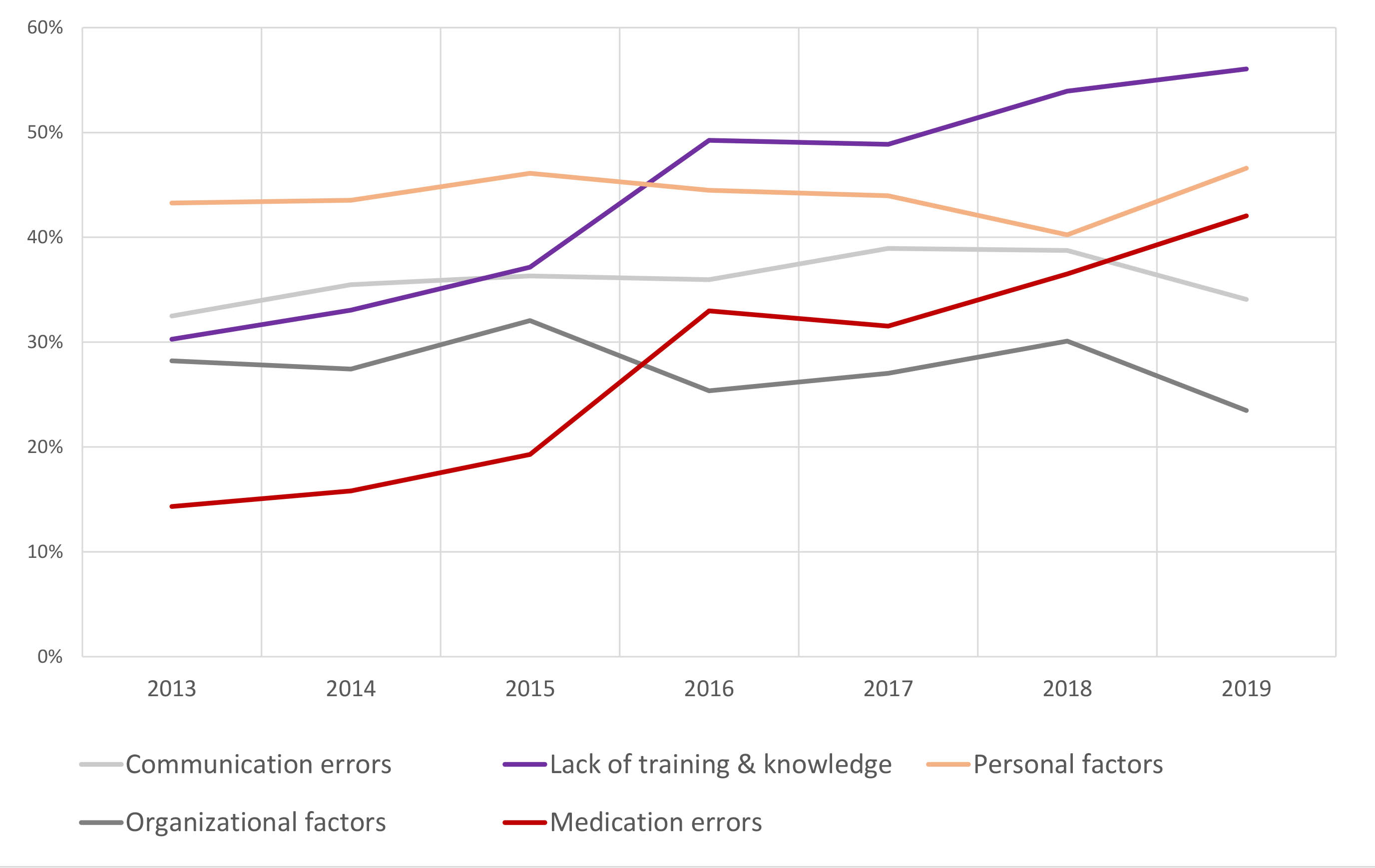 The top five factors (multiple factors per case were possible) assessed as contributing to the incidents were personal factors (e.g., fatigue, distraction, n = 2067, 44%), lack of training or knowledge (n = 2054, 43.7%), communication errors (n = 1698, 36.1%), organisational (e.g., work load, lack of resources, n = 1308, 27.8%) and medication errors (e.g., over-/underdosing, mix-ups, n = 1269, 27%). The number of contributing factors per report increased from 1.5 (2013) to 2.2 (2019). Over time, medication incidents and lack of training and knowledge increased whereas the other factors remained stable. Since 2016, lack of training and knowledge was the most cited factor contributing to more than half of all reported incidents (fig. 5). All contributing factors are listed in the appendix, table S4.
