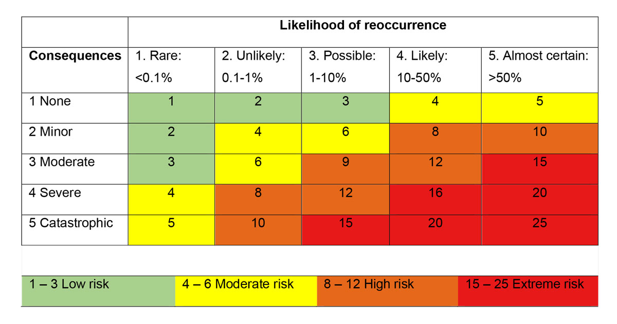 Figure 4 Risk assessment matrix according to the NHS. The colors indicate the risk score from low risk (green) to extreme risk (red). Percentages are shown in brackets.
