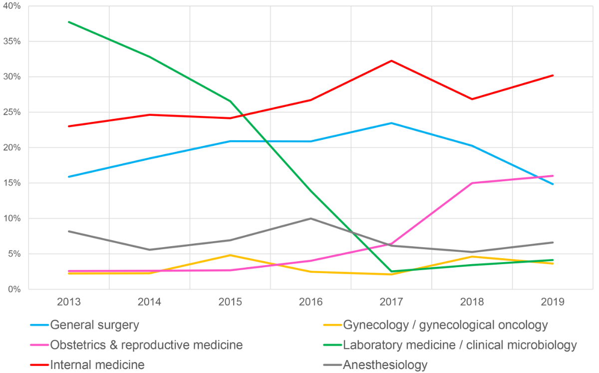 Except for laboratory medicine / clinical microbiology, reporting of the clinics remained stable or increased. Of note, the reporting by laboratory medicine / clinical microbiology decreased markedly over time. The complete table including the annual reports of all departments is shown in the appendix (table S1).