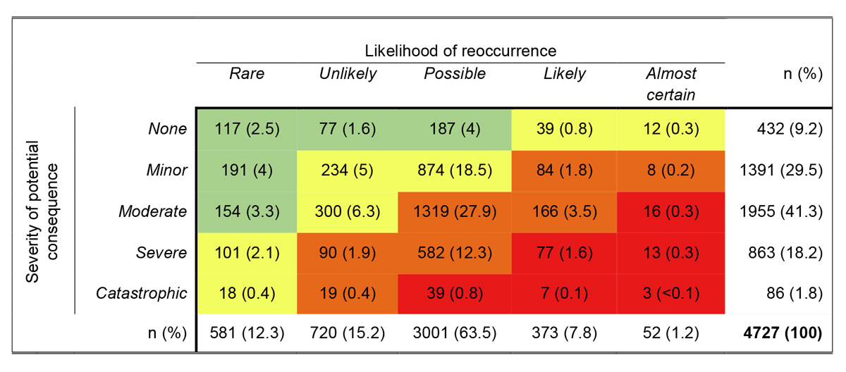 By far the most common combination of likelihood of reoccurrence and severity of potential consequences of an incident was “possible reoccurrence” and “moderate severity” (n = 1319, 27.9%), which is considered as high risk.