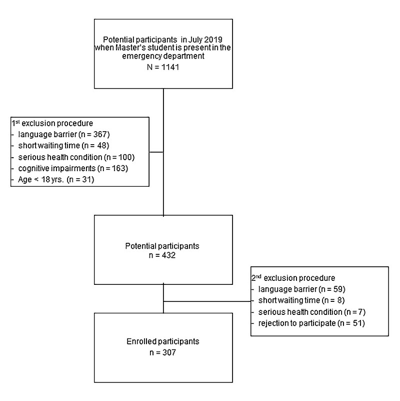 During the survey period, the Master’s student evaluated in total 1141 potential participants during his ED presence in July 2019. In the first selection step, 709 patients had to be excluded according to the exclusion criteria (fig. 1). Finally, 432 ED patients were evaluated in a second step for potential participation and further 74 patients (17.1%) needed to be excluded because of factors such as: language barrier, which were not obvious in the first step of exclusion, or lack of adequate time because of short waiting time in the ED, or recommendations by the care team not to conduct the interview due to serious or even life-threatening health conditions. Furthermore, 51 patients (11.8%) were excluded because they rejected to participate in the survey (fig. 1).