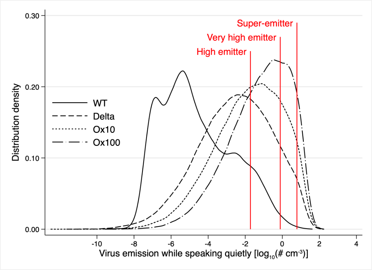 Figure 1 Distribution of viral emissions in populations infected with the WT, the Delta and the Omicron variants when speaking at low vocal intensity. Red lines indicate the high emitter (90th percentile of WT), very high emitter (99th) and super-emitter (99.9th) thresholds. Ox10 and Ox100 indicate simulations for Omicron assuming 10 times and 100 times higher mean viral loads compared to Delta.