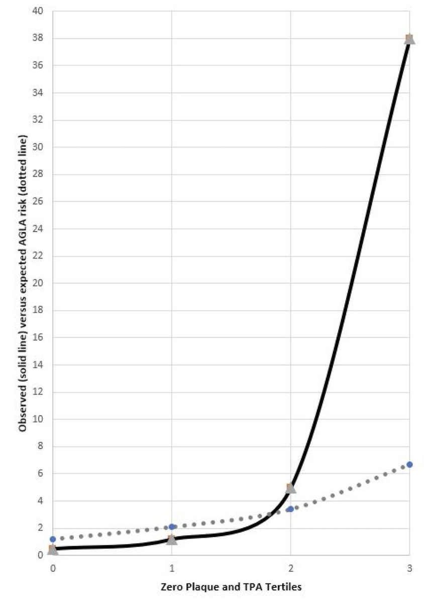 When we stratified observed events by zero plaque and TPA tertiles (table 8, fig. 2), we found that patients in the third tertile of TPA (25% of the ARCO population) had a remarkably high extrapolated 10-year risk of 38%, whereas PROCAM and AGLA on average remained low and SCORE remained in intermediate risk category on average.