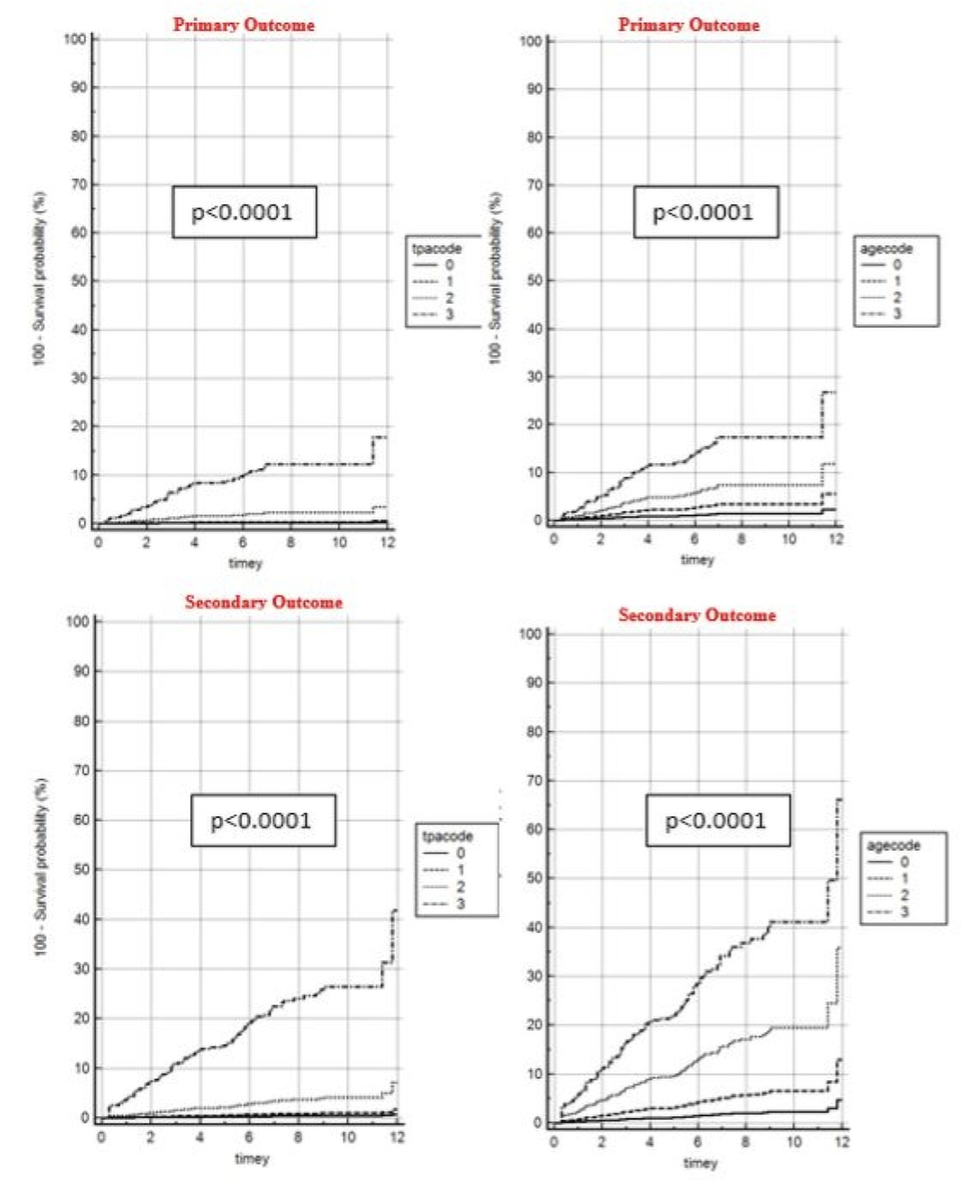 Figure 1 shows unadjusted risk prediction results for TPA tertiles and arterial age groups for the primary and secondary outcomes. A 20% risk was reached for arterial age regarding the primary outcome after 11 years, and secondary high-risk outcome was reached with TPA third tertile after 6 years and was reached with arterial age high-risk after 4 years.