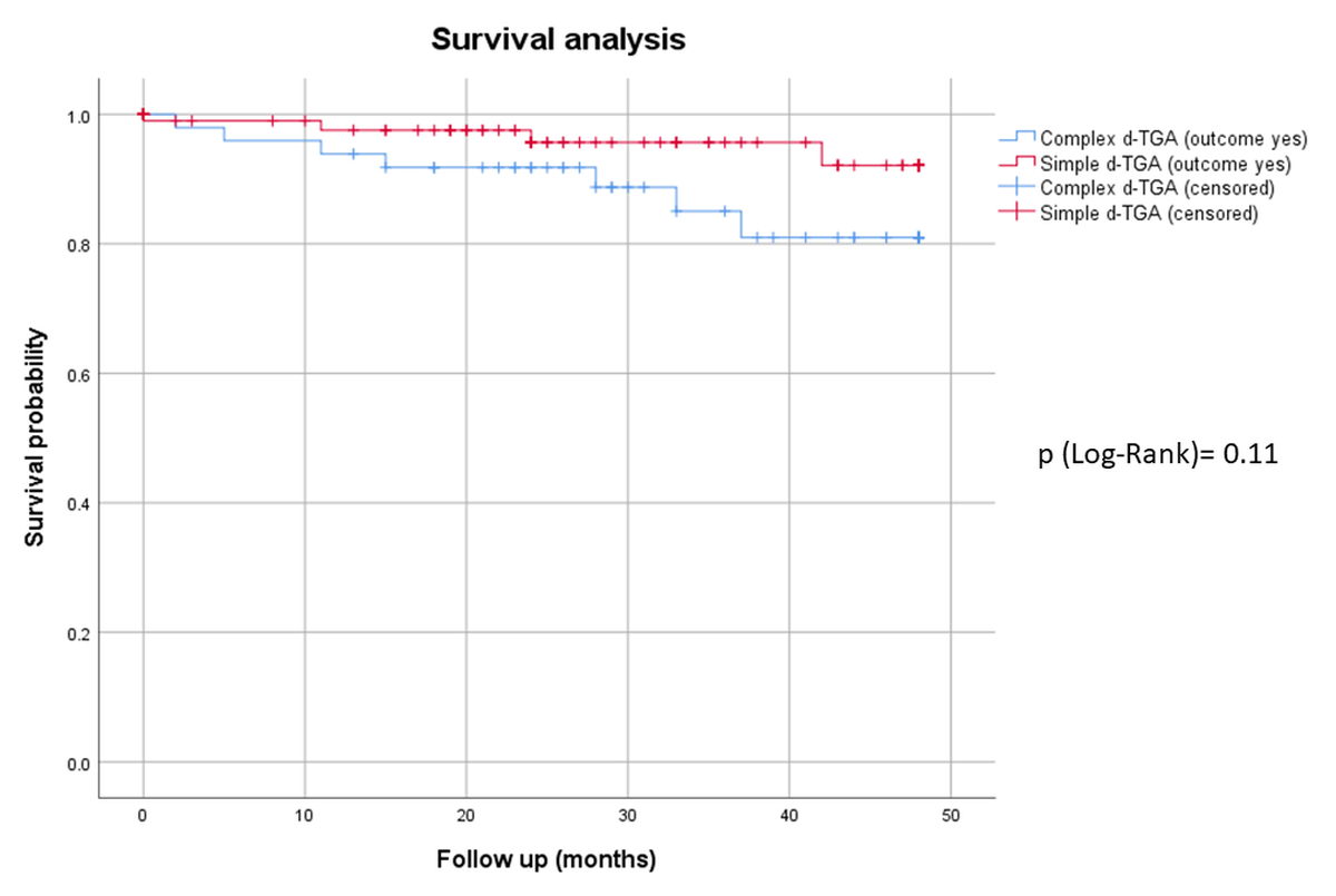 SPSS software (version 26.0, SPSS Inc., Chicago, Illinois) was used for data analysis. Baseline characteristics were stratified according to cardiac anatomy. The distributions of continuous variables were assessed using skewness, kurtosis and visual inspection of the histogram. Continuous variables were presented as mean (standard deviation [SD]) or median (interquartile range [IQR]) and compared using paired t-tests or Wilcoxon tests, as appropriate, for the comparison of dependent samples (baseline vs. follow-up parameters), and using unpaired t-tests or Kruskal-Wallis tests, as appropriate, for the comparison of independent samples (stratified baseline characteristics). Categorical variables were presented as counts (percentages) and compared using chi-square or McNemar tests, as appropriate. Survival analysis for the occurrence of the combined primary outcome in patients with simple d-TGA vs. complex d-TGA at 48 months was assessed using the Kaplan-Meier estimator. The statistical significance of differences between groups was assessed by means of the log-rank test. For all analyses, the null hypothesis was rejected for p-values <0.05.
