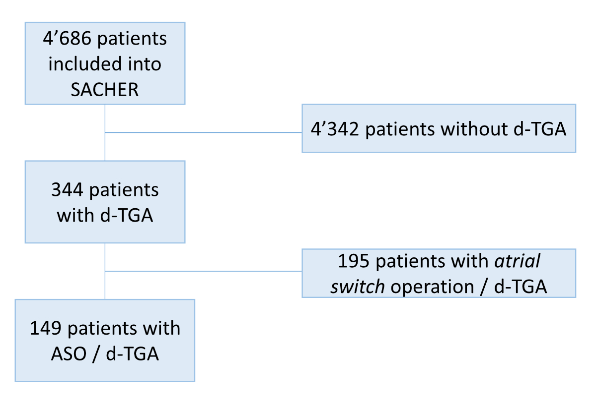 Figure S1 Flow chart. Out of a total of 4,686 patients included in SACHER, 344 (7%) had d-TGA, of whom 195 (57%) were operated on with an atrial switch and have been excluded from the analysis. All patients with d-TGA who were operated with an ASO have been included in the analysis (no exclusion criteria).
