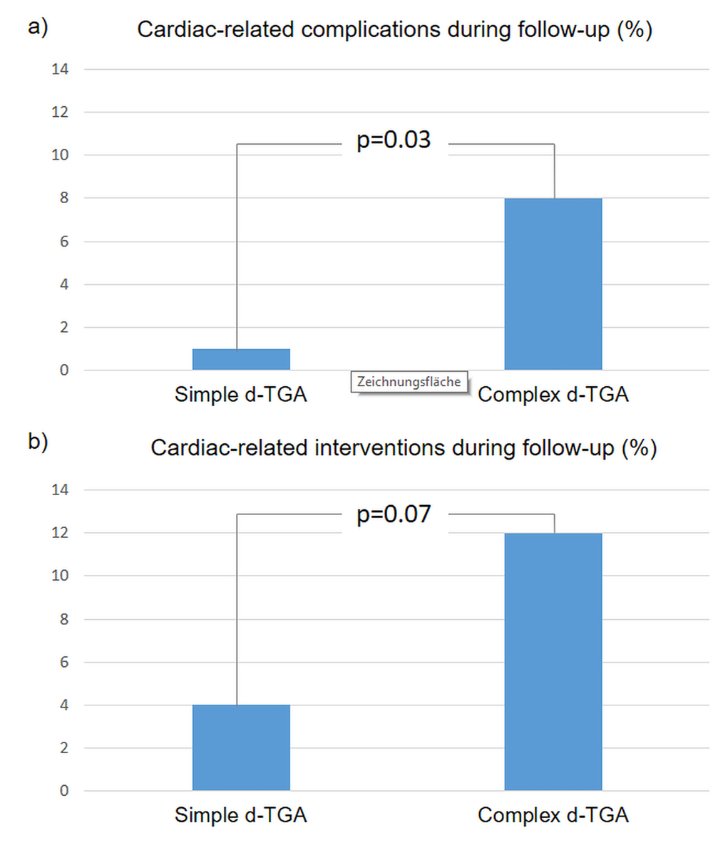 A cardiac event occurred in 11 (7%) patients. Five (3%) patients suffered from cardiac-related complications and 14 cardiac-related interventions among 10 patients were reported. Two patients died during follow-up. One patient with severe pulmonary hypertension died two days after bilateral lung transplantation due to multiple organ failure. The other patient died due to septic shock related to prosthetic valve endocarditis. Two patients had infective endocarditis after the implantation of a bio-prosthetic valve and two patients had recurrent supraventricular arrhythmia. Patients with complex d-TGA had more cardiac-related complications compared to patients with simple-d-TGA (8% vs. 1%, p = 0.03).