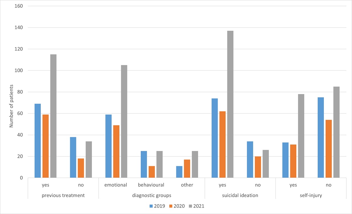 To gain a better understanding of the underlying causes of this increase in emergency contacts, relevant sociodemographic and clinical characteristics of affected children and adolescents were systematically collected from electronic patient records for the months of March/April of the years 2019, 2020 and 2021 (table 2, fig. 3). The index months (March/April) were selected because the first lockdown in Switzerland was initiated in March 2020 and compared with the same time period of the previous year (2019) and the following year (2021).