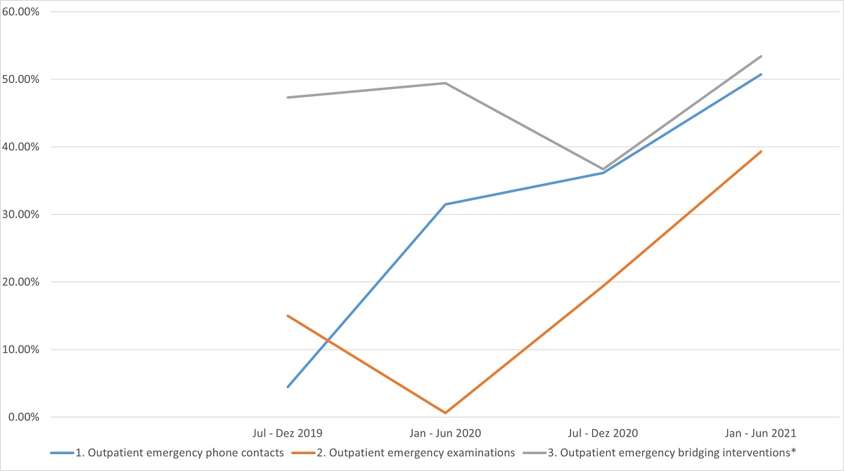 We performed a retrospective file audit of all consequtive emergency contacts with the centralised emergency service (Krisen-, Abklärungs-, Notfall- und Triagezentrum KANT) of the Department of Child and Adolescent Psychiatry and Psychotherapy of the Psychiatric University Hospital Zurich between 1 January 2019 and 30 June 2021. To investigate the impact of the COVID-19 pandemic and related protective measures, we conducted a descriptive analysis of the number of telephone contacts, emergency outpatient assessments, emergency follow-up assessments until regular outpatient treatment could be established (also called emergency bridging interventions) and emergency admissions to child and adolescent psychiatric acute care inpatient units. Furthermore, we analysed the number of emergency admissions of minors to adult psychiatric acute care inpatient units due to a lack of capacity in child and adolescent psychiatry. In addition to the quantitative analyses of service use, the impact of the pandemic on serious mental health symptoms was estimated based on the clinical characteristics mentioned in the electronic patient files. In particular the presence of suicidal ideation and self-harm behaviour were recorded (as present or not).
