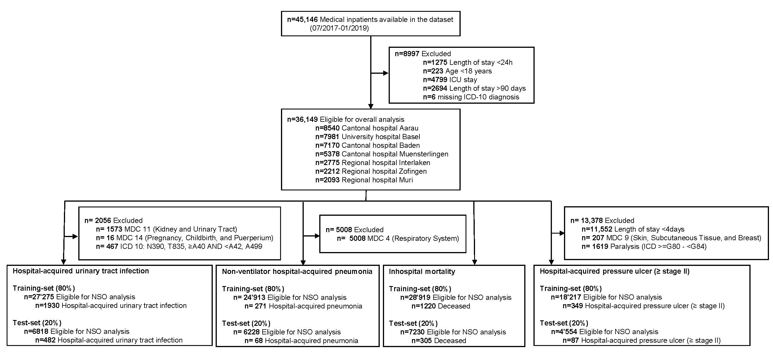 We included all consecutively admitted adult (≥18 years) emergency patients from July 2017 to January 2019. Patients had to be hospitalized on a medical ward in one of the following seven secondary and tertiary care hospitals: Cantonal Hospital Aarau, Cantonal Hospital Baden, Cantonal Hospital Muensterlingen, Hospital Muri, Hospital Zofingen, Hospital Interlaken, and University Hospital Basel. We excluded patients with a length of hospital stay shorter than 24 hours or longer than 90 days and patients who have been treated in the intensive care unit (ICU) as part of their hospitalisation because the NSOs under study have not been developed for use in these patient populations.