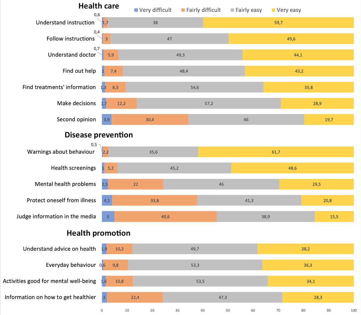 Finally, less than 25% found it "very difficult" or "fairly difficult" to deal with different types of issues/aspects related to health promotion. A minority of 10.4% of respondents had difficulties judging which everyday behaviours are related to the person's health, 12.1% understanding health advice from family or friends, 12.4% learning about activities that benefit mental well-being, and 24.4% understanding information in the media on healthy living.