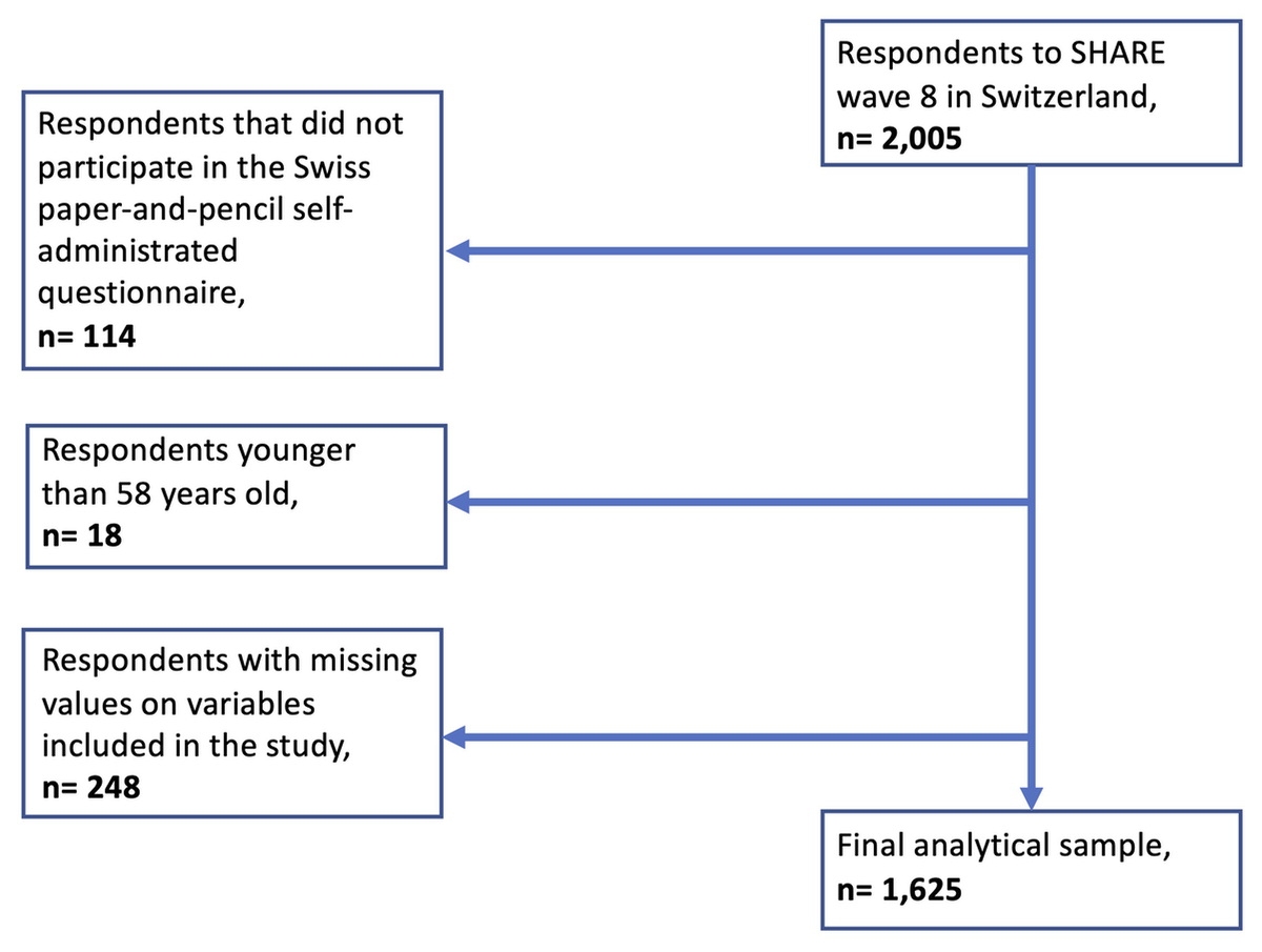 We use data from the Survey of Health, Ageing and Retirement in Europe (SHARE), a biennial population-based longitudinal study of Europeans aged 50 years and older that started in 2004 [13]. SHARE collects information on health, socioeconomic status, and social networks of targeted respondents and their partners in 27 European countries and Israel, using Computer-Assisted Personal Interviewing (CAPI). In Switzerland, a random sample of older individuals were invited to participate in the longitudinal SHARE sample and have been invited to participate in the survey every two years. During each survey round, respondents give their consent to participate in the SHARE study twice: when they accept the invitation to schedule a personal interview and when they take part in the face-to-face interview. In addition to an internationally harmonised in-person interview, respondents answer a country-specific paper-and-pencil self-administered questionnaire. Our database thus combined the Swiss questionnaire containing a short health literacy assessment with the variables from the main interview. These data were collected for the 8th wave of SHARE, between October 2019 and the beginning of March 2020. SHARE wave 8 included 2,005 participants in Switzerland, either as targeted respondents or their partners. Among them, 1,891 individuals also completed the self-administrated questionnaire, resulting in a cooperation rate of 94.3%. The Swiss SHARE sample was designed to be nationally representative of individuals aged 50 years and older and their partners. It is periodically refreshed to maintain its representativeness of the target population. Since the last refreshment sample for SHARE Switzerland took place in 2011, the Swiss SHARE sample of wave 8 (2019/2020) is no longer representative of the population of adults aged 50 to 58. Therefore, our study only includes respondents aged 58 and older to be representative of Swiss citizens. Finally, after eliminating 18 respondents younger than 58 years old and 248 respondents with missing responses on some variables included in this study, our analytical sample comprises 1,625 participants (Figure 1).
