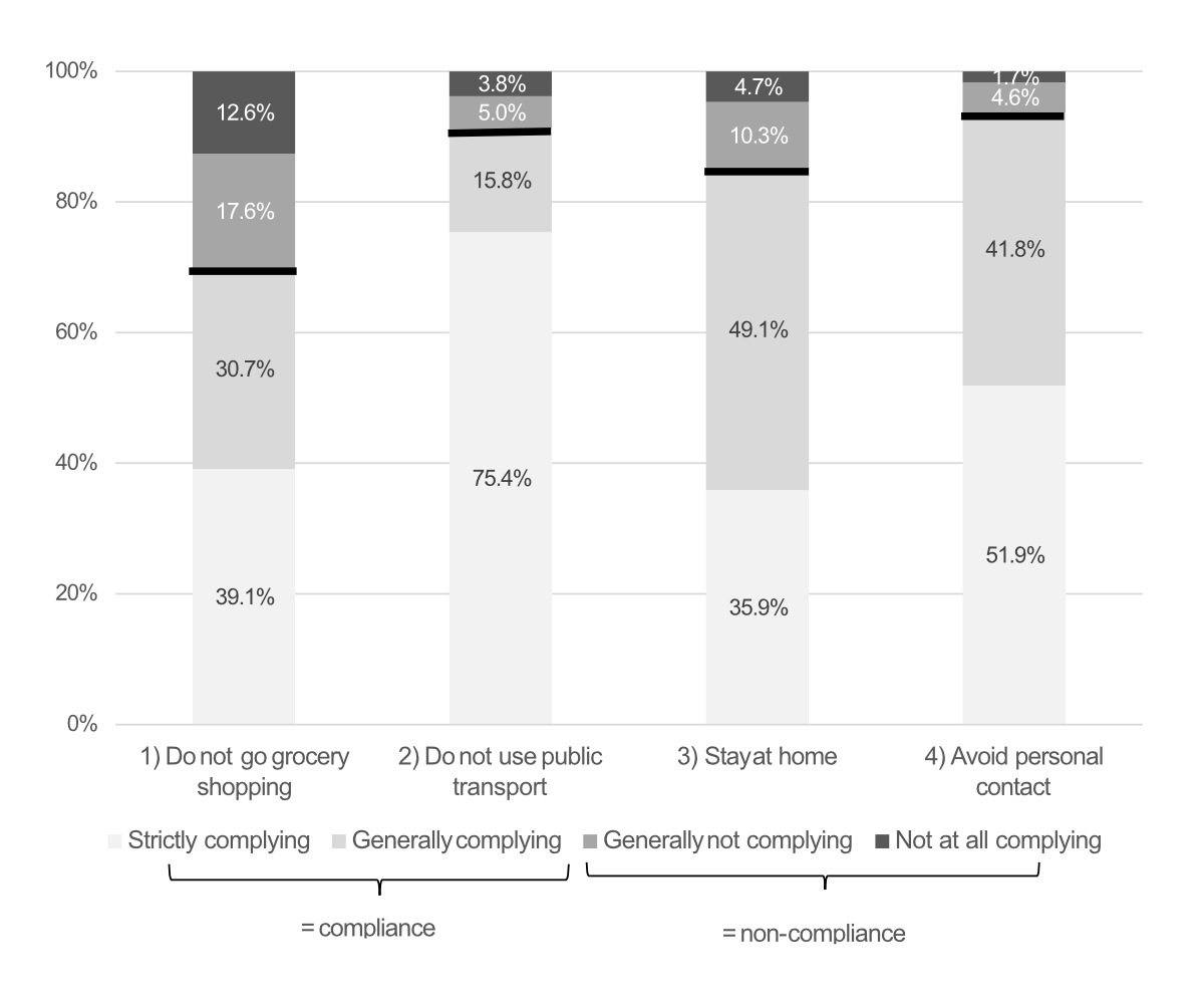 The proportion of participants who strictly complied with each recommendation ranged from 35.9% for staying at home to 75.4% for avoiding public transport (fig. 2). After "yes, rigorously" was grouped with "generally, yes", almost two thirds (63.6%) of the participants complied with all four recommendations. The level of noncompliance was highest regarding the recommendation not to go grocery shopping, followed by the ones about staying at home and avoiding public transport and personal contact.