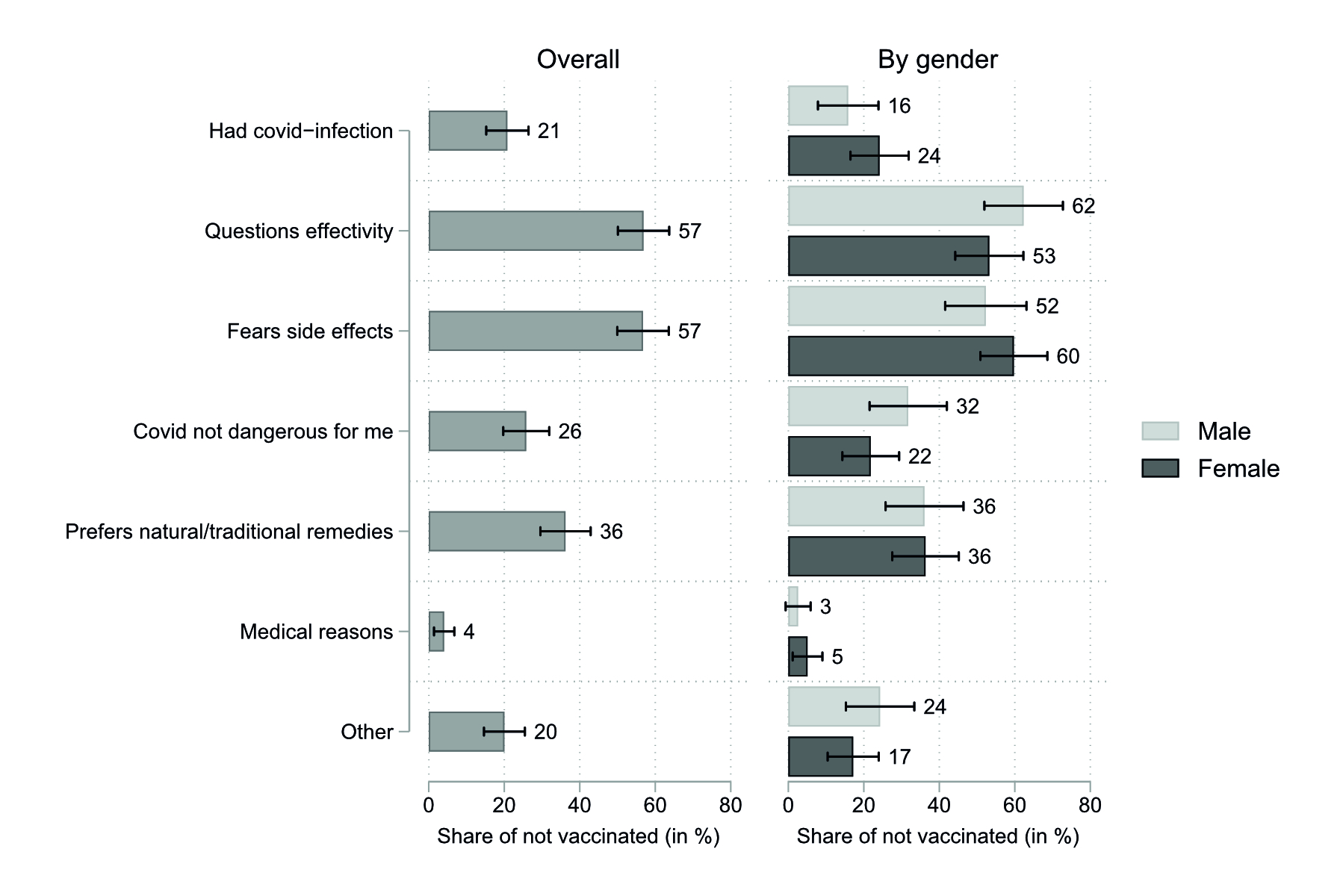 Finally, we report the reasons for not being vaccinated as proportions of the nonvaccinated according to responses in the last survey wave (overall, and by gender). Data analysis was carried out with Stata/SE version 17.0, the analysis do-files are provided in the supplement S4.