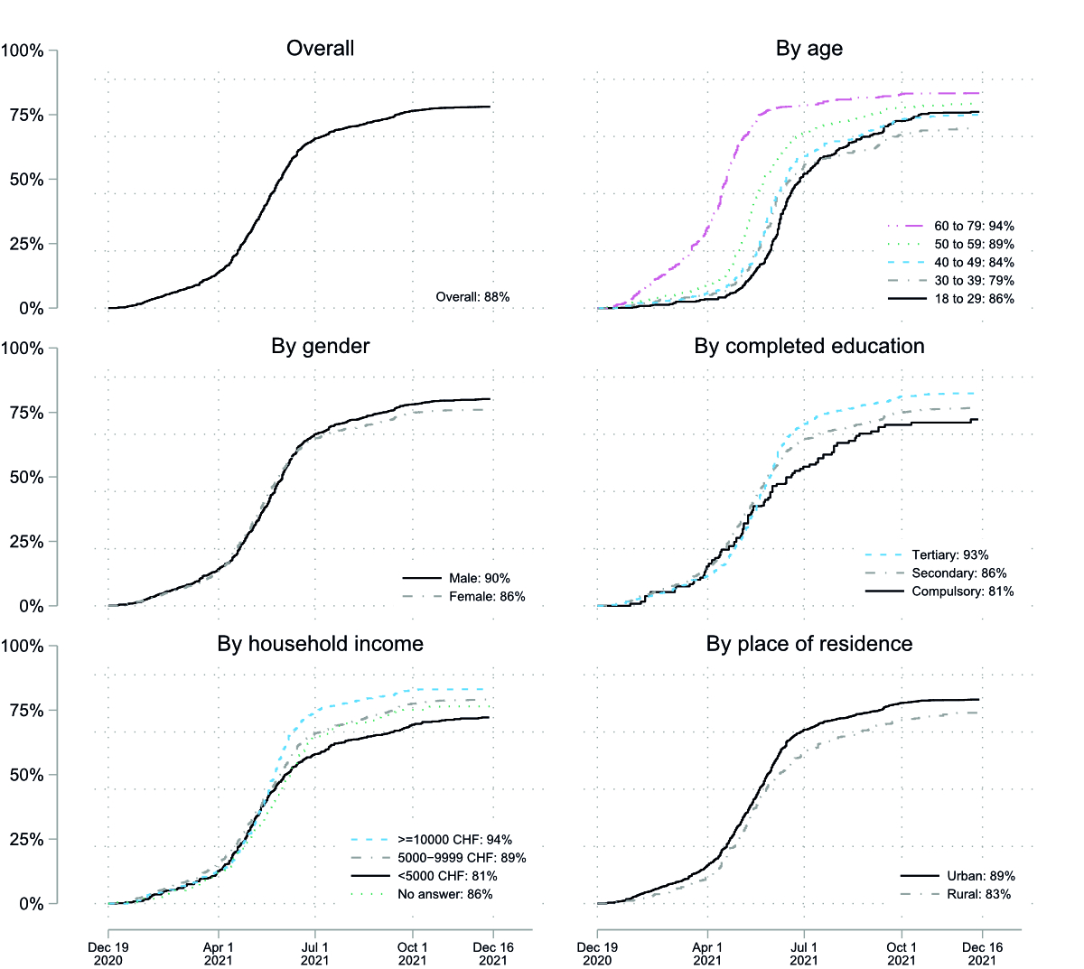 Vaccination uptake differed considerably between age groups; in particular, the elderly aged 60 to 79 years showed a much earlier and faster uptake. Between other soci-demographic groups there were differences too, albeit on a smallerscale: respondents with compulsory schooling, with lower household income as well as those living in rural regions showed a slower uptake and a lower rate at the end of the study period. Respondents with compulsory schooling showed the lowest rate at 81%, those in the income group CHF ≥10,000 the highest at 94%.