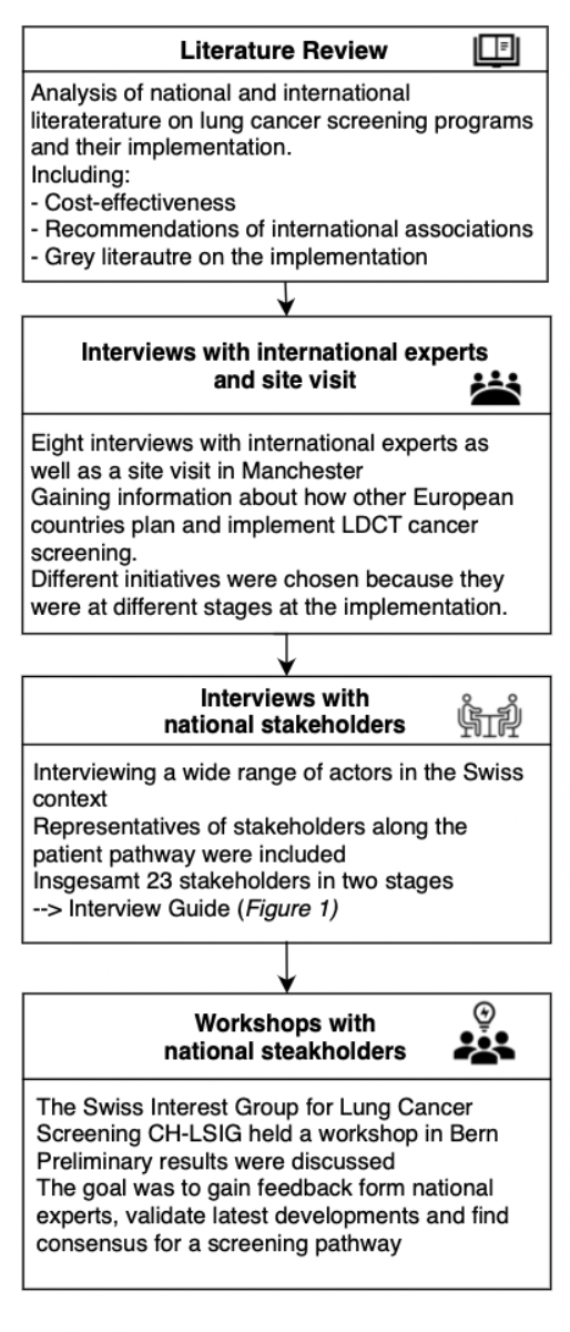At the beginning of 2020, after the first stage of the interviews was completed, a workshop of the Swiss Interest Group for LCS (CH-LSIG) was held in Bern. Preliminary results of the study were discussed with the members of the group. A second workshop with the CH-LSIG took place in late fall 2020. The goal of the workshops was to collect feedback from the national experts and to validate the latest developments of the project. To reach a broader audience for feedback on the progress of the project and to disseminate the idea of a potential model of LDCT screening, we also organized a workshop and presented our conclusions in a parallel workshop at the Public Health Conference in Switzerland in 2020. A flowchart showing the step-by-step framework is given in figure 1.