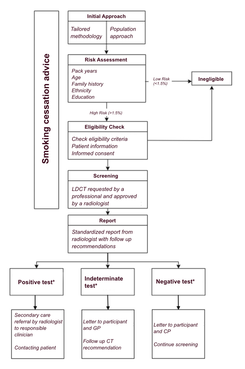 As part of the risk assessment and lung health check, smokers will be offered access to a smoking cessation program. Smoking cessation advice will be independent of eligibility for LDCT screening. The advice on smoking cessation should be face-to-face between the participant and a dedicated health professional. Pharmacotherapy may be offered as part of the smoking cessation program to enhance the possible effect on quitting smoking.