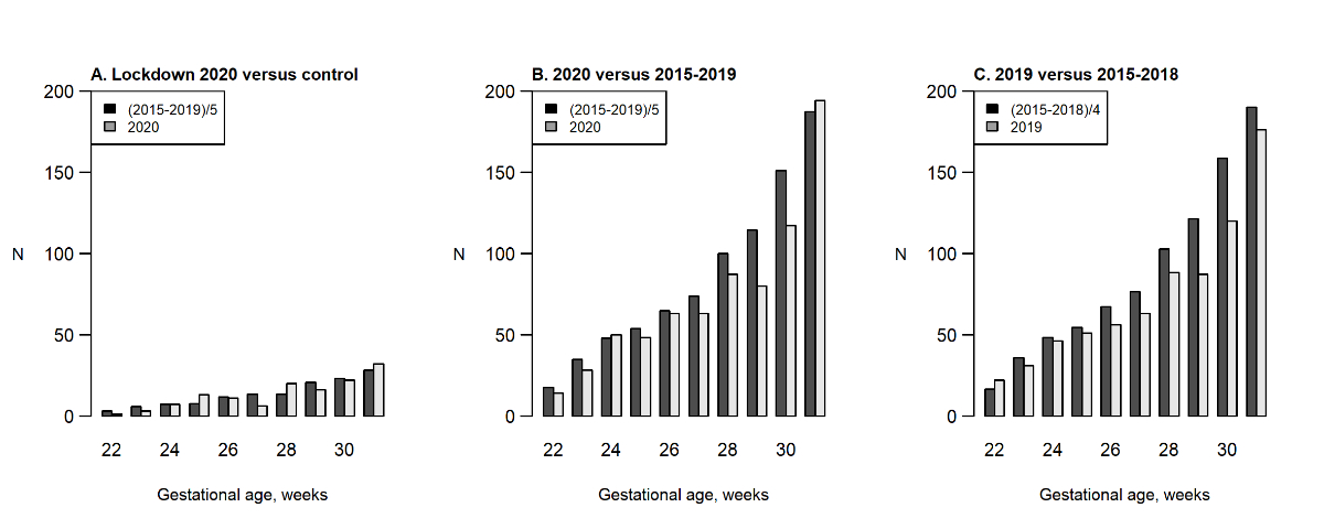 The COVID-19 pandemic, based on the uncontrolled proliferation of the novel SARS-CoV-2 virus, had a dramatic impact on many areas of public life and public health. In the field of neonatology, several reports evaluated the incidence of preterm births in relation to the pandemic. Most declared a reduced incidence of admissions, some as dramatic as 75% or more. To date, six reports have covered a large geographical region. They were published from Ireland, Denmark, the Netherlands, the UK, Japan and the Lazio region in Italy, and all declared a substantial decrease in infants born between 22–27 weeks, 28–31 weeks, and 32–36 weeks or above, corresponding to extremely preterm, very preterm, late preterm or term born infants [1–6]. Most of the reports speculate that it was not the virus itself that contributed to the observed reduction, but instead the mitigating measures implemented by governments to limit the pandemic. Among those measures were reduced mobility leading to less pollution, physical activity and overall infection rates.
