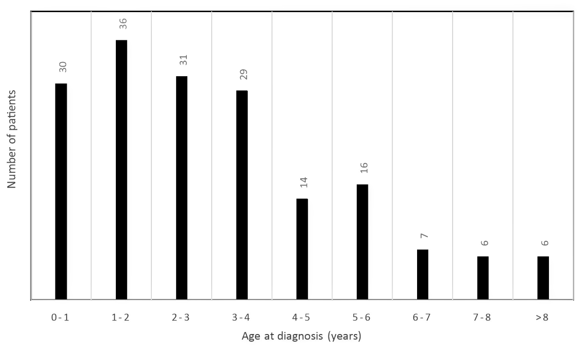 Therefore, 175 patients were included in the analysis, with a mean age of 38.2 (+/–31.0) months, 105 (60%) of them were boys (table 1). The patients under 5 years of age represented 81% of the children diagnosed with Kawasaki disease, as illustrated in figure 2. The most frequent clinical signs reported were a rash in 146 patients (85.4%) and changes of the lips and oral/pharyngeal mucosa in 145 patients (83.4%). Complete Kawasaki disease was reported in 107 patients (61.1%).