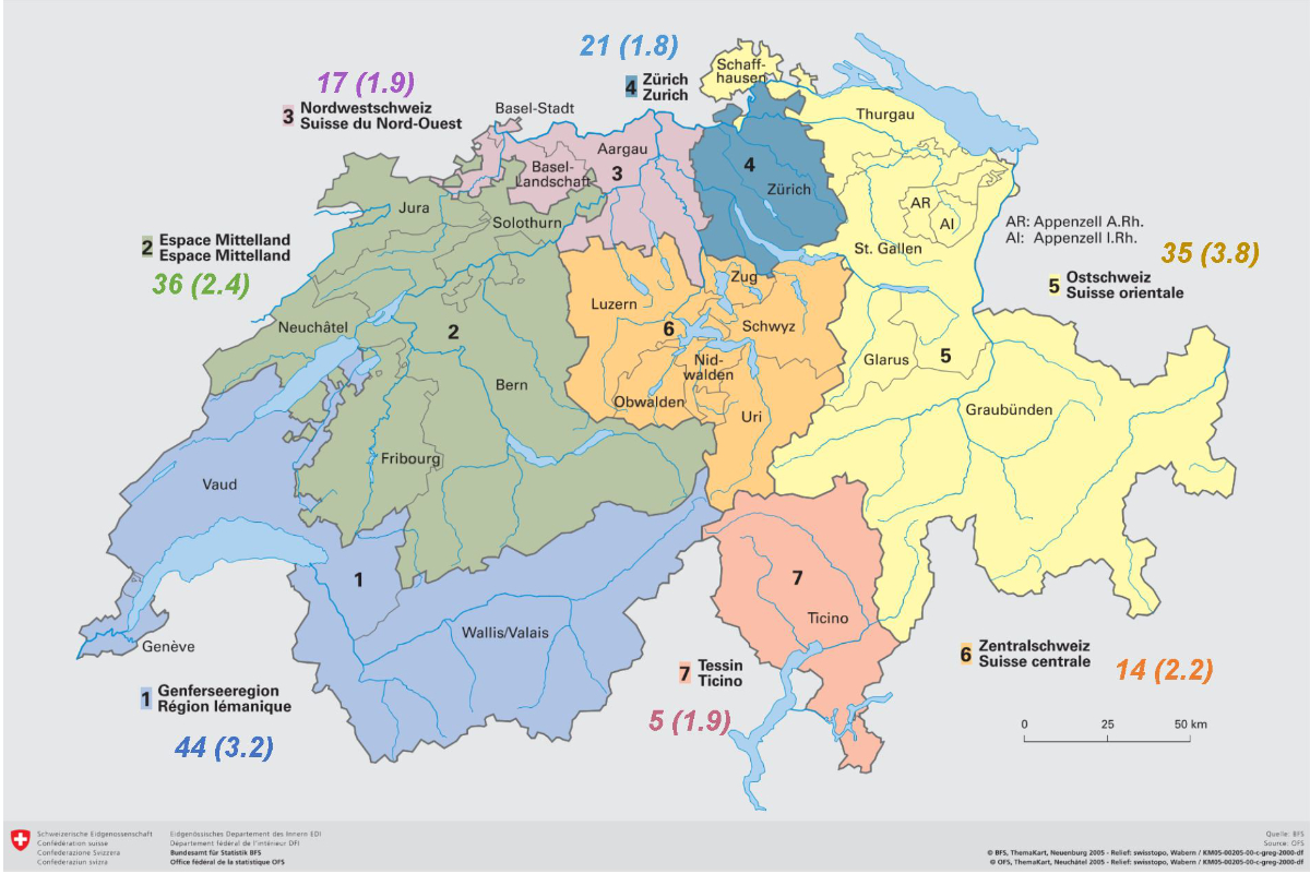 Figure 4 Geographical repartition of patients with Kawasaki disease in Switzerland, by residence. The major incidence was in “Suisse orientale” with 3.8/100,000 children under 18 years old per year and the lowest in Zurich with 1.8/100,000 children under 18 years old per year. (Comment: Three children were foreigners diagnosed during holidays. They don't appear on the map but are included in the study.). Copyright: Office fédéral de la statistique