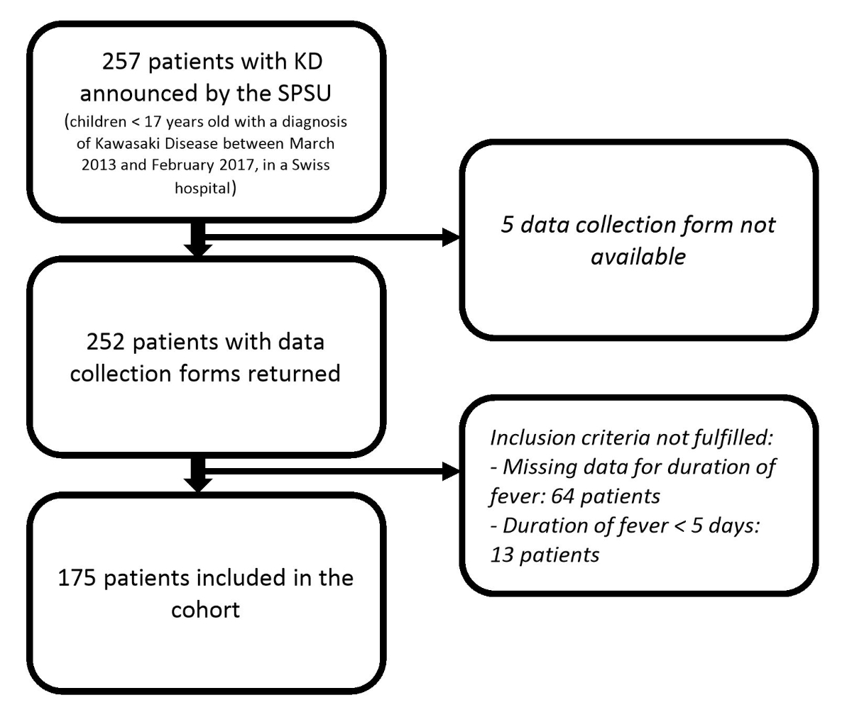 Figure 1 Flow chart of the study showing the inclusion and exclusion process of the patients. 257 children were reported by the SPSU. 5 data collection forms were not returned and therefore were excluded of the study. 64 forms didn’t mention fever duration and 13 patients were diagnosed with Kawasaki disease before completing 5 days of fever. These patients were excluded of the study. 175 patients were included in the cohort.