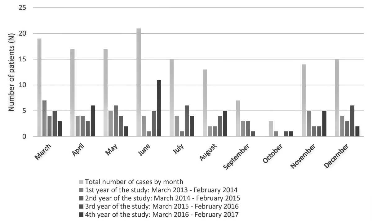 Seasonal variation was low and non-consistent between the four years of the study, except for September and October, during which the lowest incidence was reported. Japanese data over a 14-years period shows some similarities, with a nadir in October and two peaks in January and June, with the incidence in between being high but not peaking. The authors mention a viral trigger as a possible explanation [19].