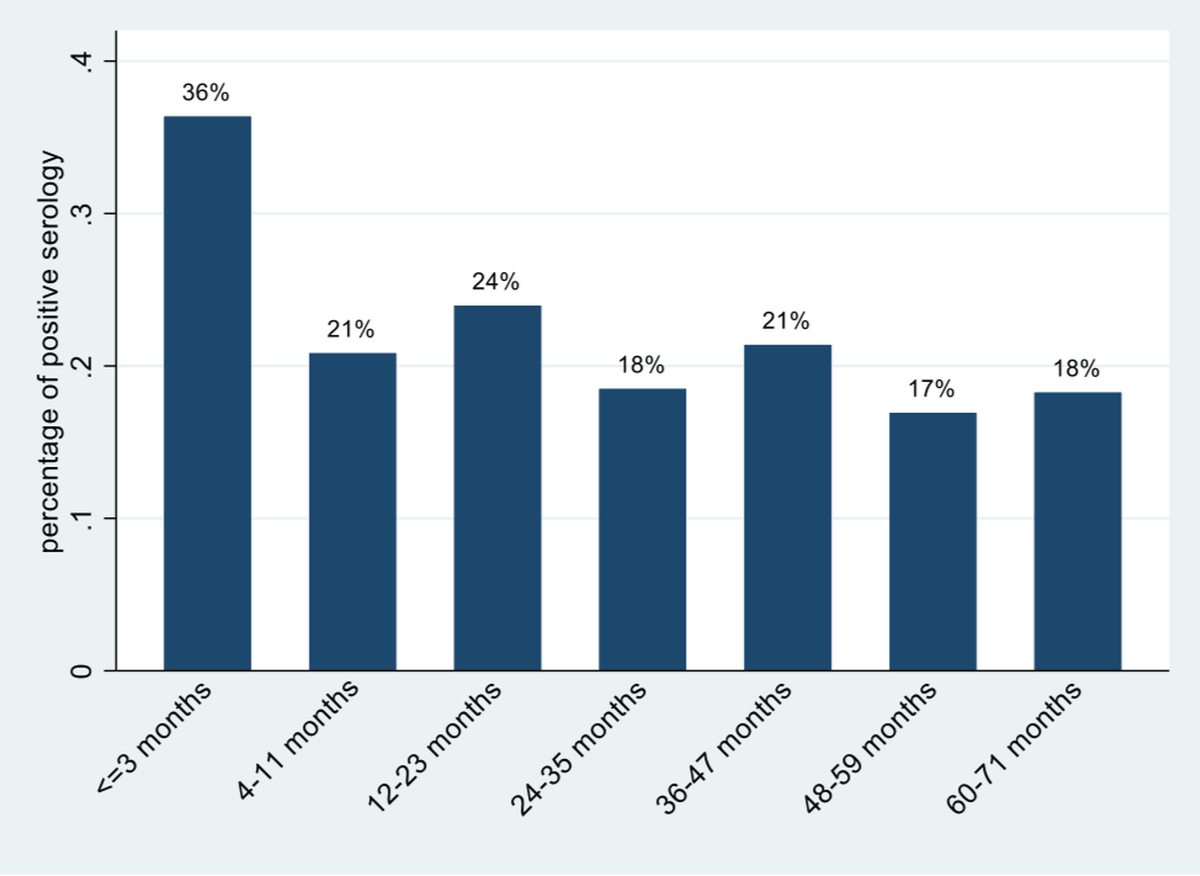 We found that for children less than 3 months of age, the risk of being seropositive is positively associated with an increase in the number of family members, and this is reversed for older children. It is possible that the risk of transmission within the family is greater for younger children since they can be infected by both parents and older siblings. Moreover, children less than 3 months usually have much closer and longer physical contact with parents than older children. A decreasing contact with parents might protect children living in large families. Also, mitigation measures are easier to follow when children are older.