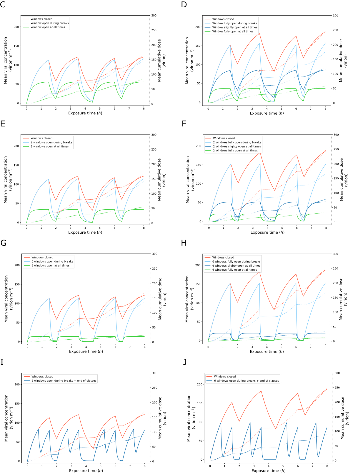 Figure 1 c-j (c–j) Estimated mean viral concentration profiles over the exposure time (solid lines, left y-axis) and consequent estimated mean cumulative dose of virions absorbed by the exposed hosts (dotted lines, right y-axis). The red lines show the results for the baseline scenario, the blue and green lines show the results for different natural ventilation scenarios. (c–h) Light blue: windows are fully open during yard and lunch breaks only. Green: windows are fully open (60 cm) all day. Dark blue: windows are partly open (20 cm) all day. (c, d) Results with one window. (c) Spring/summer simulations. (d) Winter simulations. (e, f) Results with two windows. (e) Spring/summer simulations. (f) Winter simulations. (g, h) Results with six windows. (g) Spring/summer simulations. (h) Winter simulations. (i, j) Results with six windows opened for 10 minutes at the end of each class in addition to yard and lunch breaks. (i) Spring/summer simulations. (j) Winter simulations.