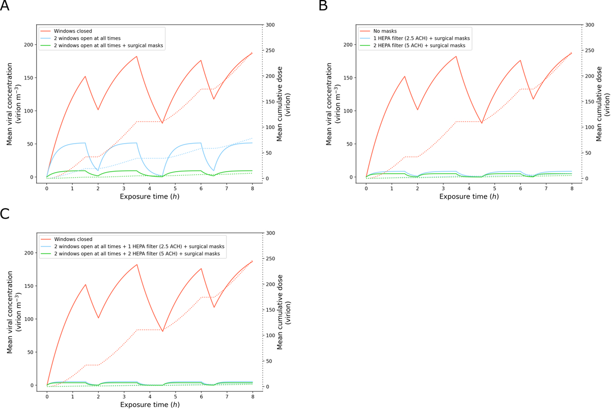 Using the COVID Airborne Risk Assessment (CARA) modeling tool [20], we found that surgical face masks, HEPA filters and strategic natural ventilation are effective strategies to reduce the cumulative dose of virions absorbed by exposed individuals in a classroom setting. We also showed that these interventions have cumulative effects and should be implemented together for maximum benefit. This is in agreement with the results of a recent study of the US CDC that — using a breathing aerosol source simulator — showed that HEPA filtration combined with face masks can reduce the mean aerosol concentration by 90% [30].