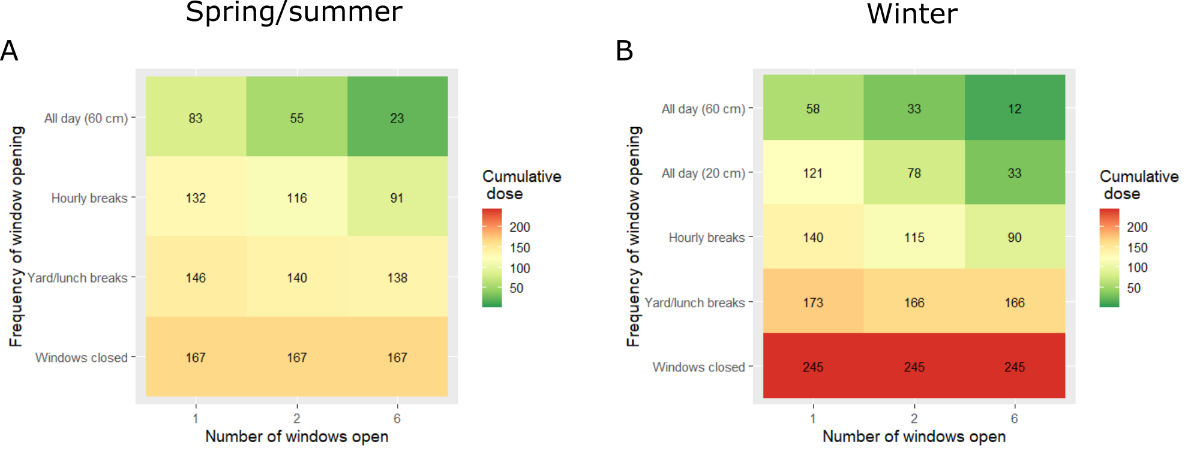 Opening windows during yard and lunch breaks had only a minimal effect on the cumulative dose of virions absorbed, with decreases in cumulative dose ranging from 1.1-fold to 1.5-fold depending on the season and number of windows open. Importantly, although the effect was stronger in winter (1.5-fold), it only decreased the cumulative dose to values that are similar to the baseline values in spring/summer (166 virions). In contrast, opening one, two or six windows all day long during spring/summer decreased the cumulative dose absorbed 2-fold, 3-fold and 7-fold, respectively, compared with the baseline scenario (leading to mean cumulative doses of 83, 55 and 23 virions, respectively). Keeping windows open all day was most effective in winter, with a 4-fold decrease in the cumulative dose absorbed when one window was fully open (58 virions), a 7.5-fold decrease when two windows were fully open (33 virions) and a 20-fold decrease when six windows were fully open (12 virions). Since leaving windows wide open during the heating season is unacceptable (waste of heating energy and thermal discomfort), we tested a 20-cm opening all day long, leading to a 2-fold decrease in the cumulative dose when one window was open (121 virions), a 3-fold decrease when two windows were open (78 virions) and a 7.5-fold decrease when six windows were open (33 virions). We also tested the opening of six windows at the end of each class (referred to as “hourly breaks”), leading to 1.8-fold (spring/summer) and 2.7-fold (winter) decreases in cumulative dose (down to around 90 virions in both cases).